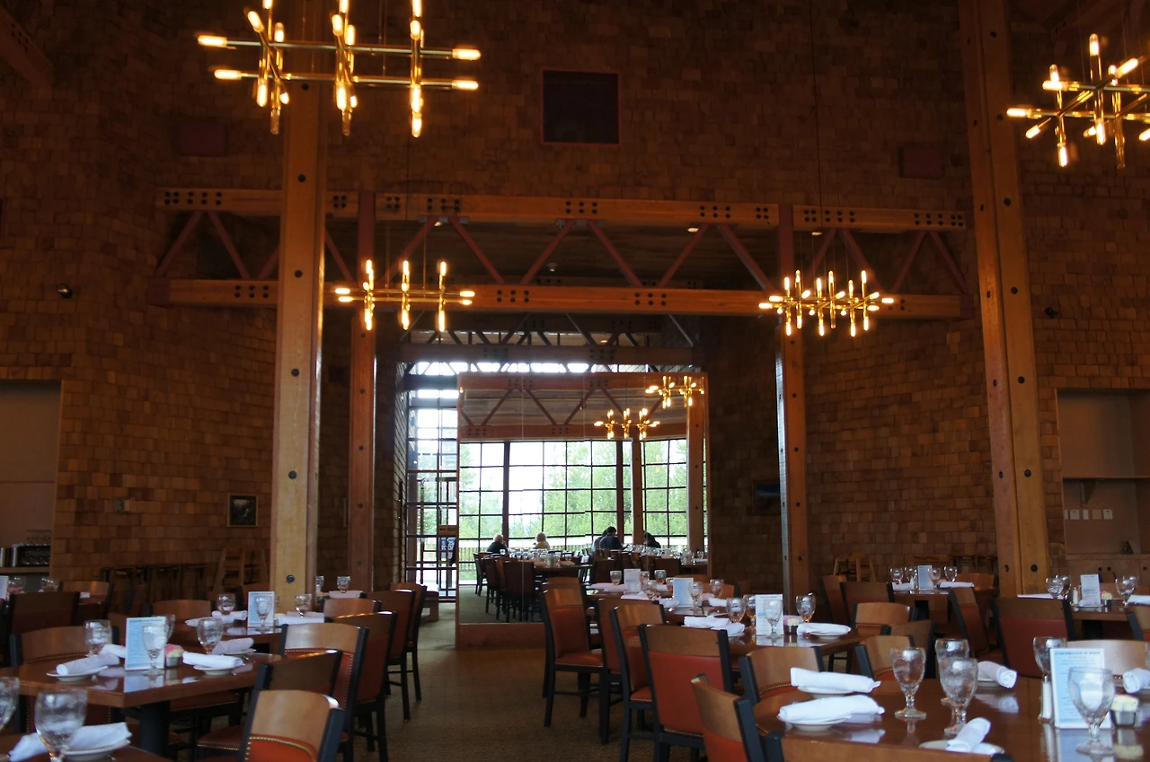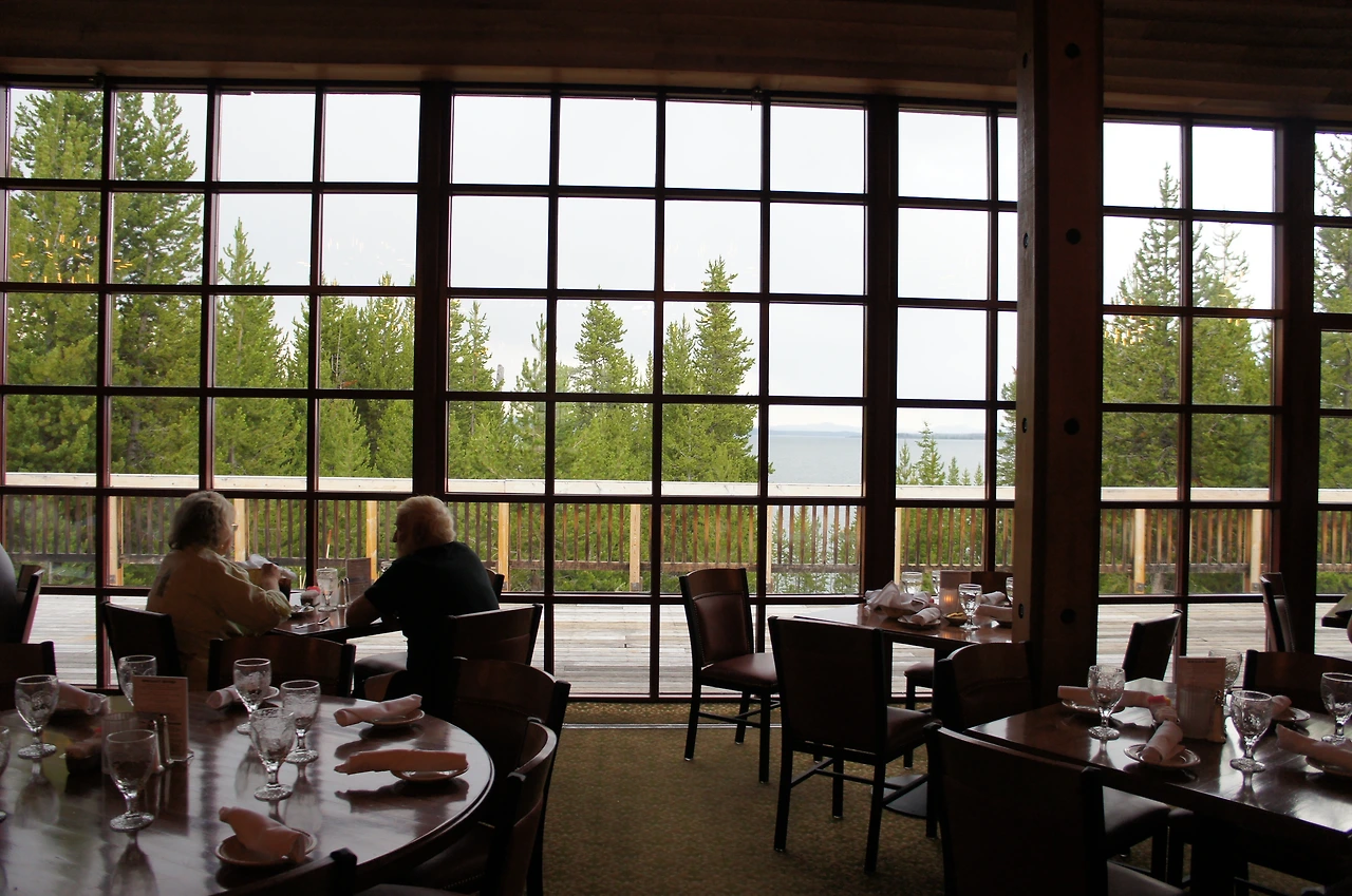 식당으로 들어가 보니 높은 천장과 한쪽 벽에 크게 나있는 유리창이 인상적이다. 유리창 너머로는 저 멀리 옐로스톤 호수가 보인다.