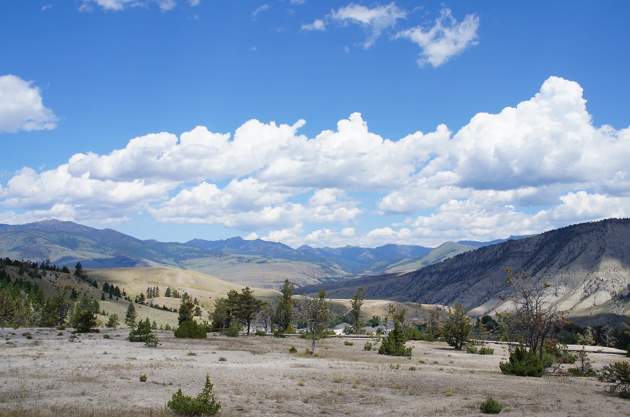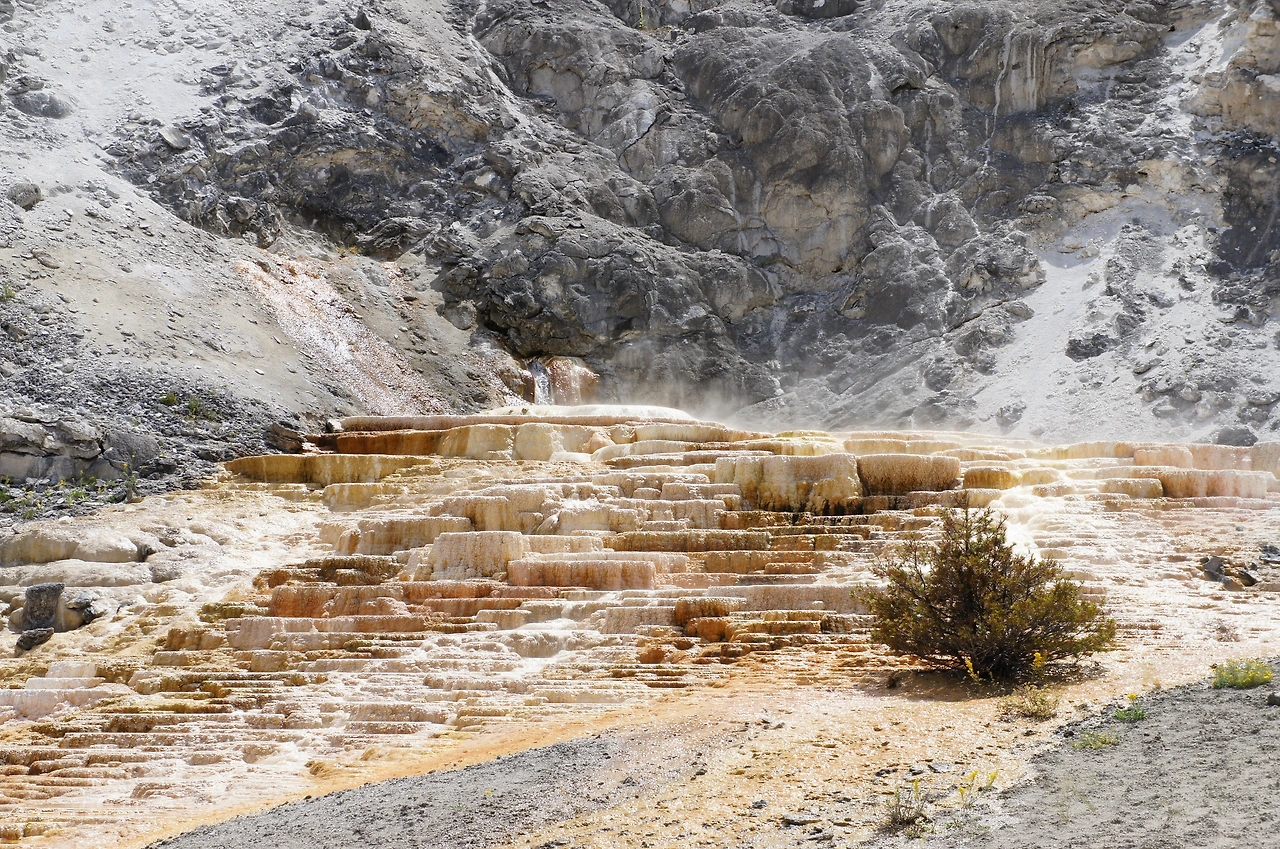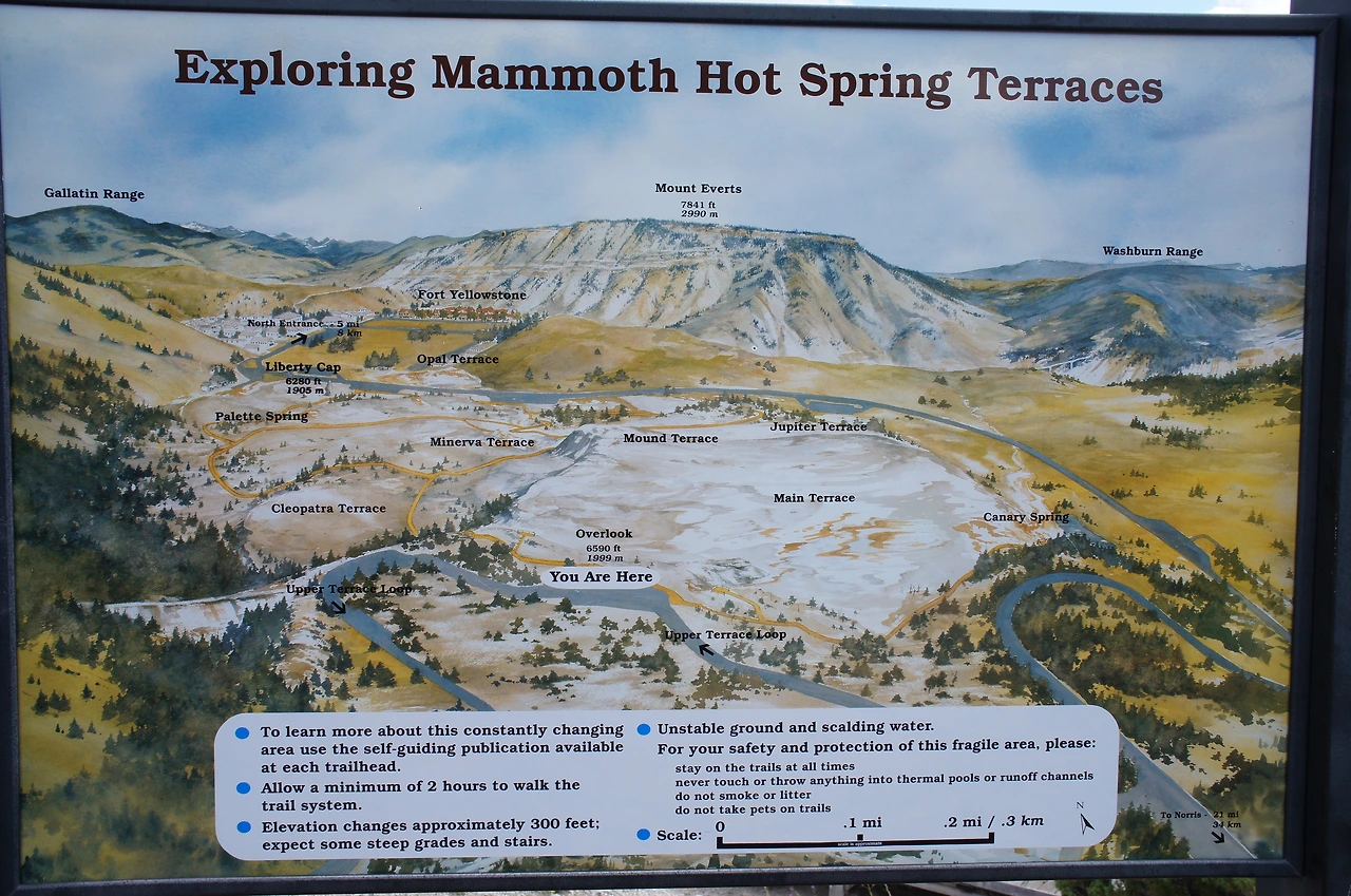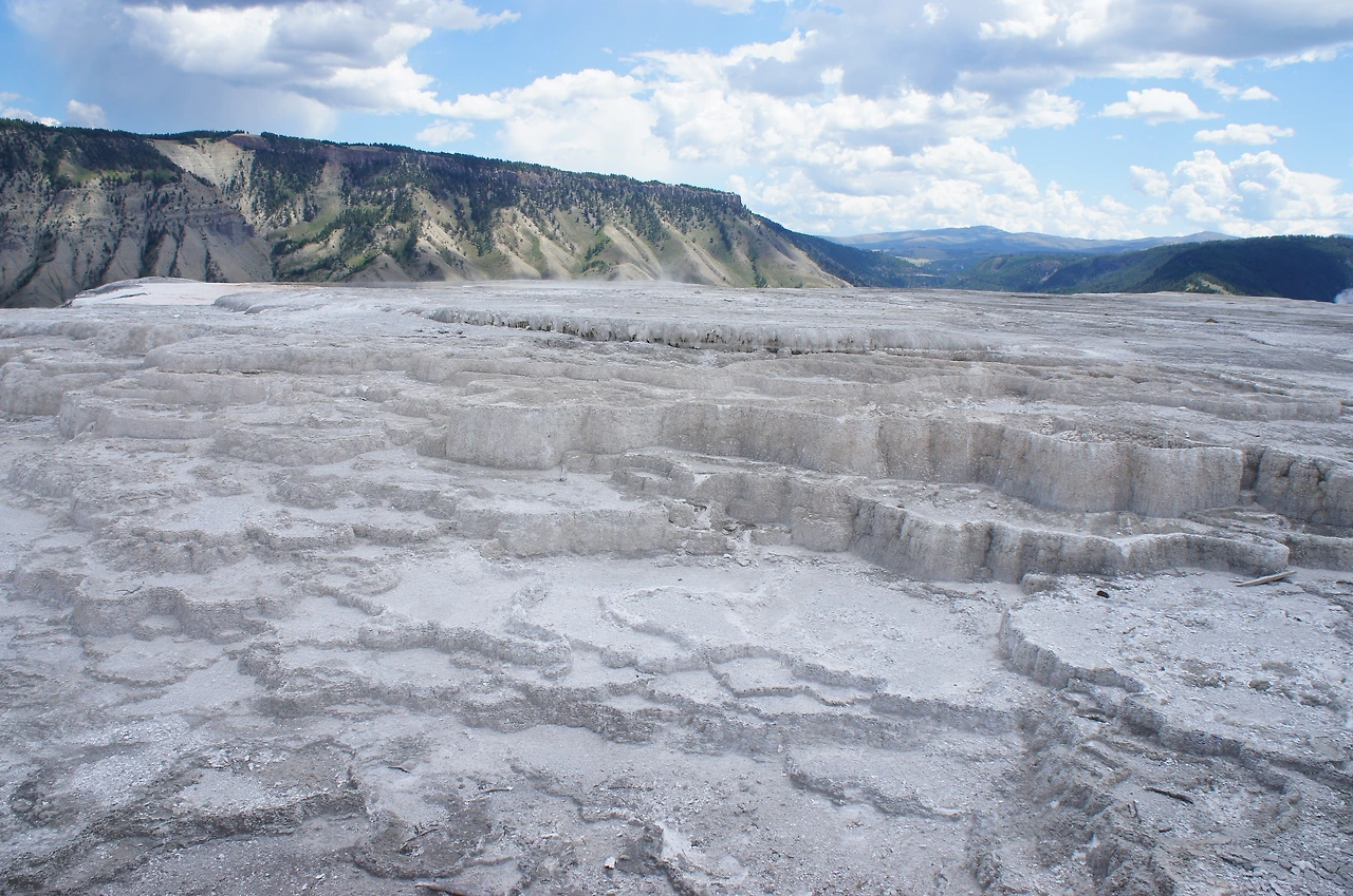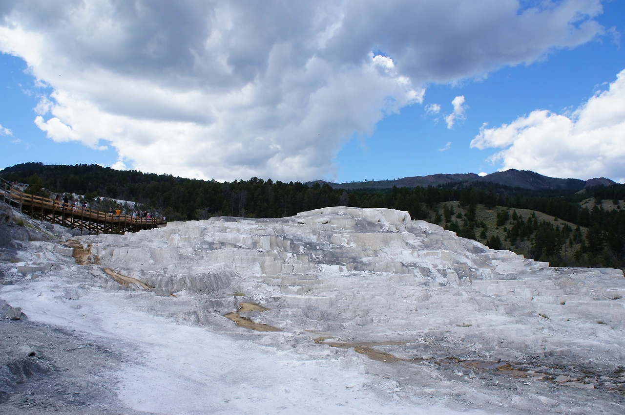 땅 속에서 솟아 나온 뜨거운 온천수가 수천 년 동안 석회암 테라스를 만들어 놓아 지금까지 보아온 가이저, 베이신 지역과는 전혀 다른 분위기의 지역인데, 온천물이 끊겨 흰색의 석회암만이 덩그러니 놓여있다 보니 황량하다 못해 참담한 곳이 되어있었다.