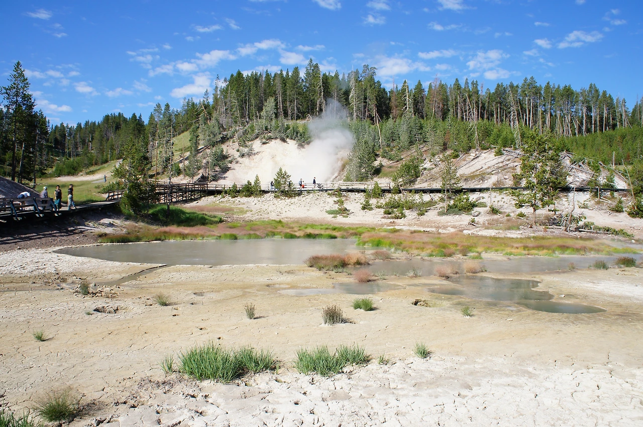 자, Mud volcano 지역으로 출발~! 저 멀리 드래곤 마우스 스프링(Dragon’s Mouth Spring)이 보인다.