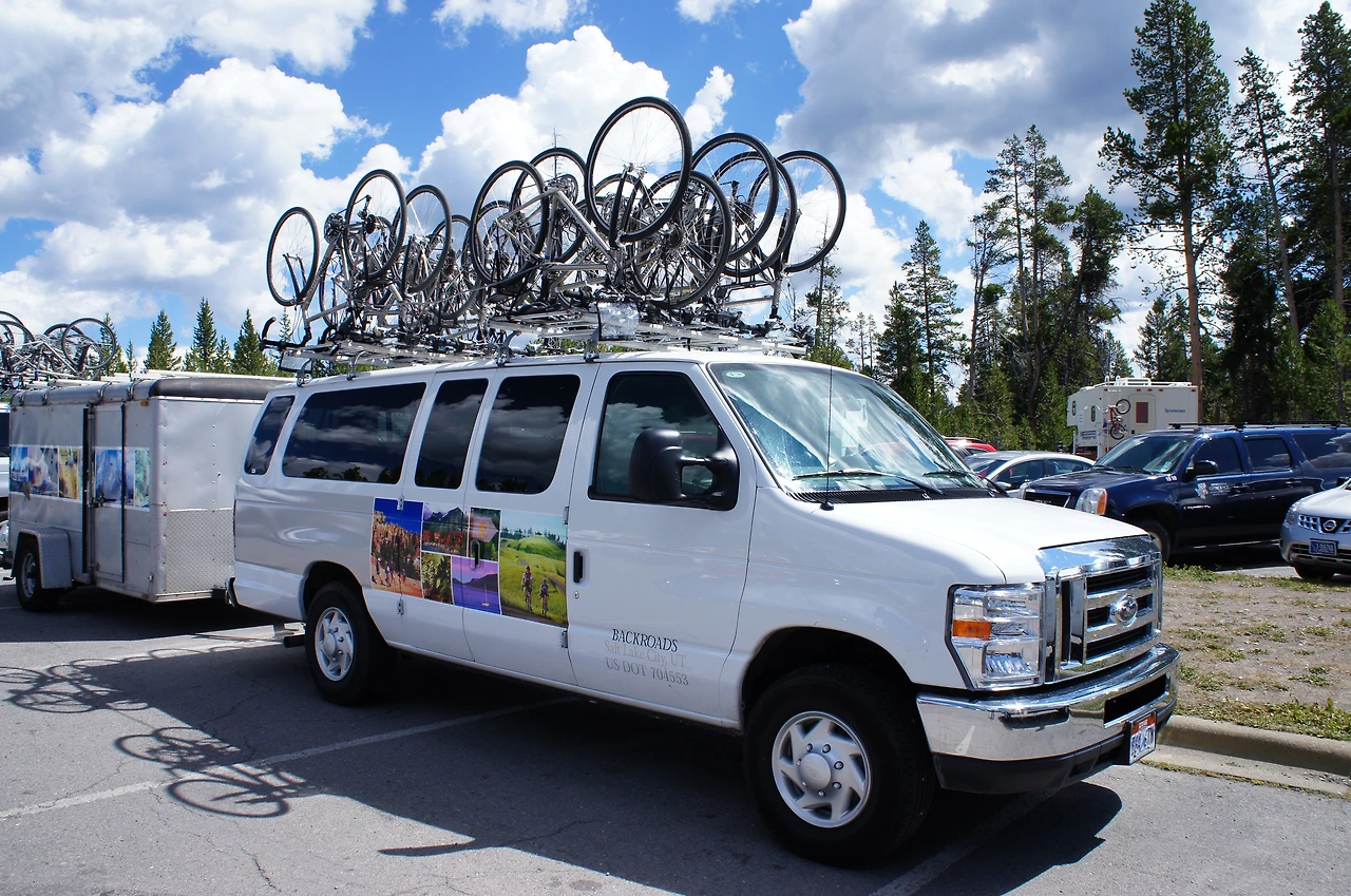 이제 매머드 핫 스프링(Mammoth Hot Spring) 지역으로 출발~! 가던 길에 잠깐 쉬러 들렀던 주차장에서 보았던 자동차. 자전거 동호회에서 왔는지 차량 지붕에 잔뜩 실린 자전거들이 인상적이다.