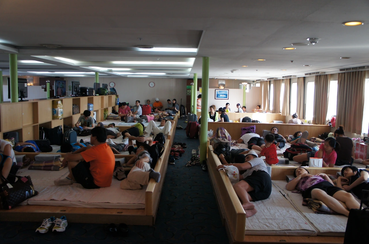 큰 장점은 비용도 저렴하고, 배안에서 잠을 잘 수 있어서 숙박비가 절약된다는 것이지만 큰 단점은... 모르는 사람들과 부대끼며 하룻밤을 지내야 한다는 것이다.
