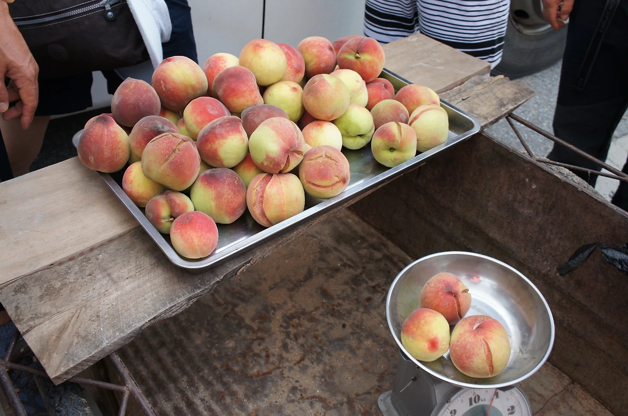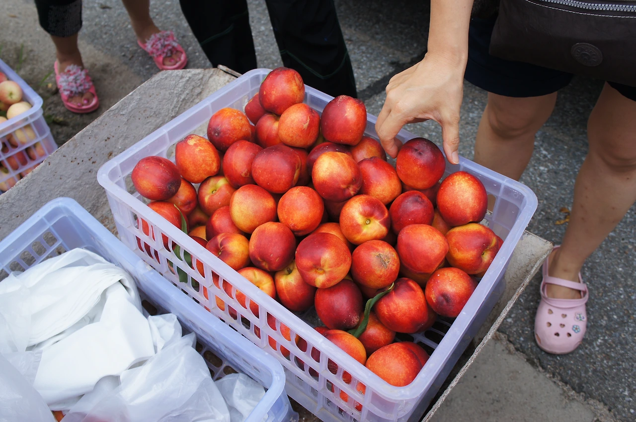 가는 중간, 휴게소에 잠시 들렀는데 복숭아를 판다. 상품성이 많이 떨어지는 듯...
