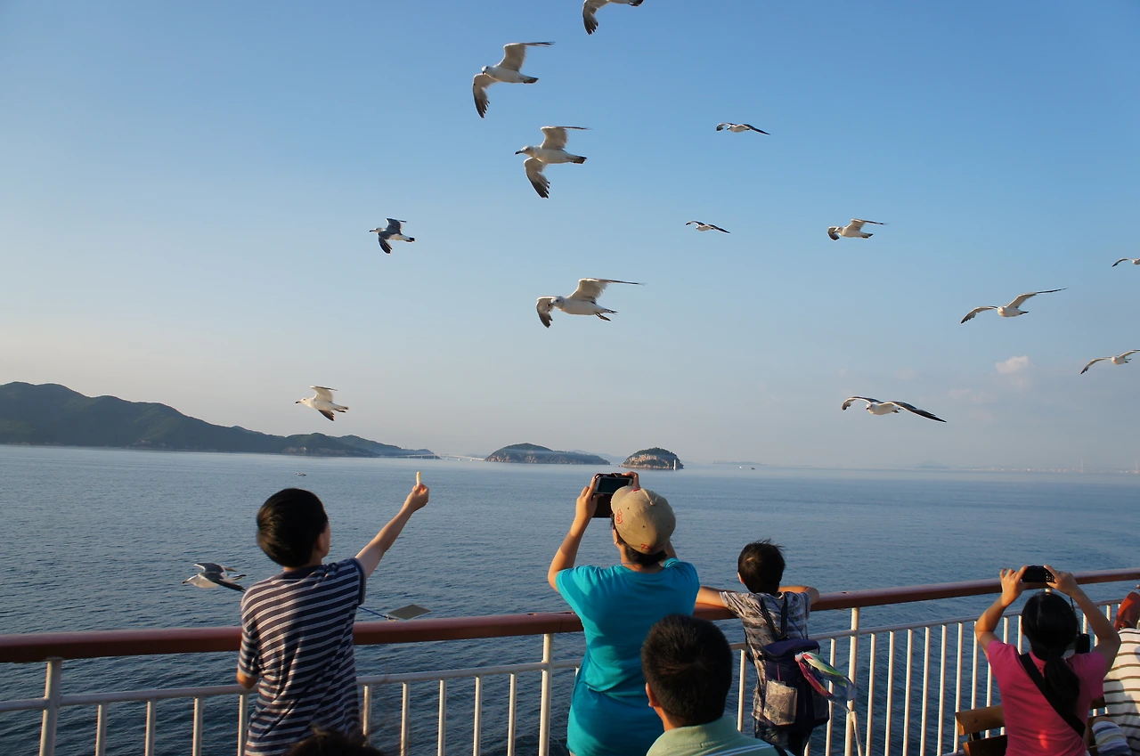 배가 더 먼 곳으로 이동하자 갈매기들은 다시 제 갈길을 가며 멀어져 간다.