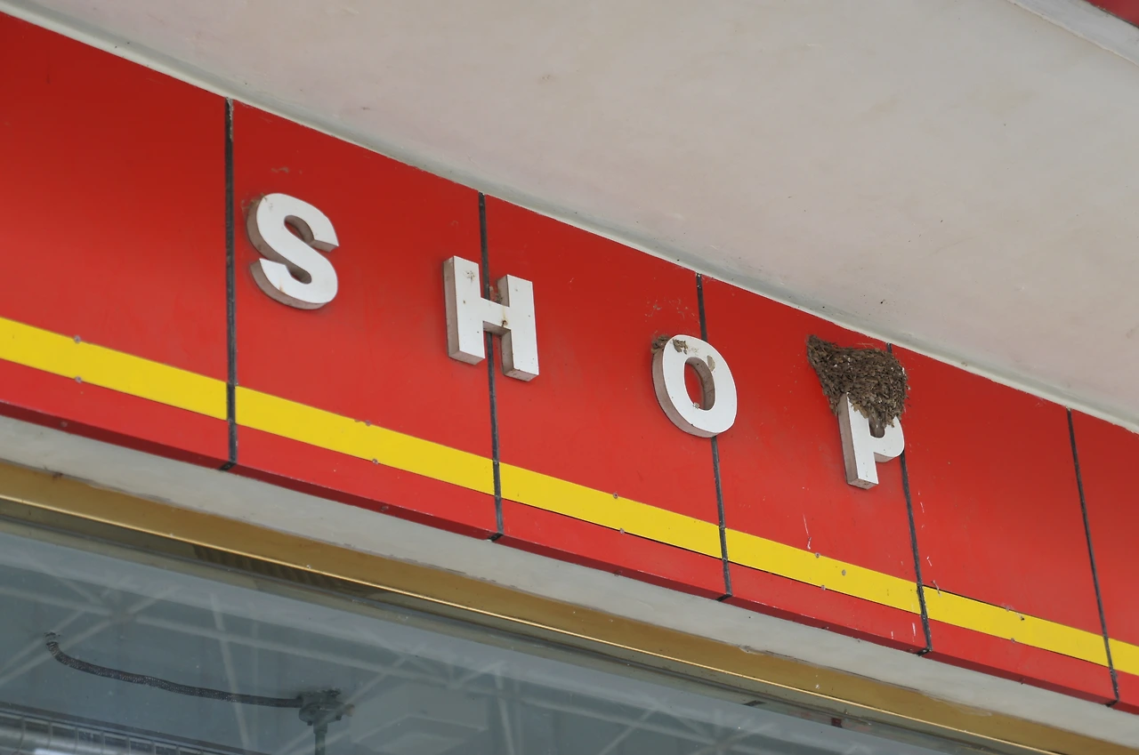 휴게소 간판에 제비가 집을 지어놓았다.