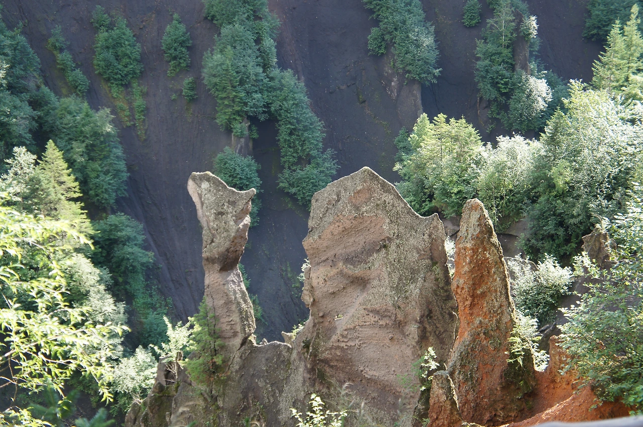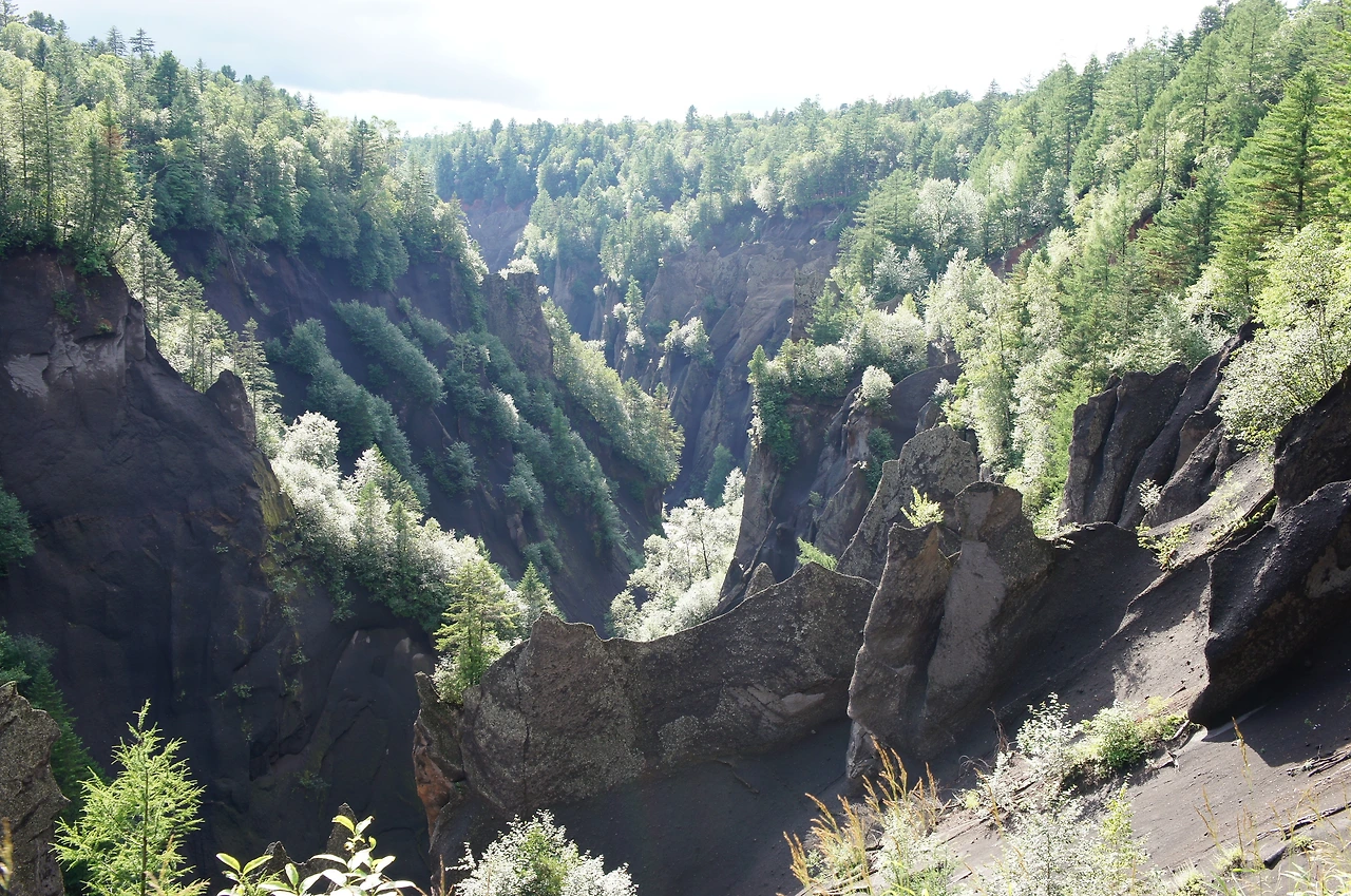 이것이 백두산 대협곡이다. 백두산이 화산 폭발을 일으킬 때 용암이 흐르던 자리가 오랜 세월 비바람에 씻겨 이루어진 것으로 협곡 주위로는 원시림이 장관을 이루고 있으며 협곡 바닥에는 맑은 물이 흘러간다. 협곡의 크기는 폭이 평균 120m, 깊이는 평균 80m이고 길이는 10Km나 된다고 한다.