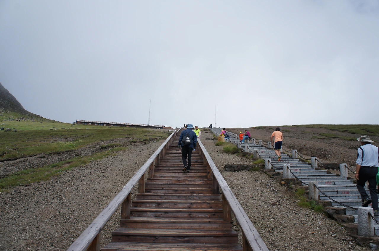 마음이 급해지기 시작한다. 늦게 가면 구름에 다시 천지가 가려져 버리지 않을까 걱정이 앞선다. 숨은 가쁘고 다리는 뻐근하여 좀 쉬었다 가고 싶었지만 꾸욱 참고 온 힘을 다해서 계단을 바삐 올라간다. 드디어 정상 부분에 모여있는 사람들의 뒷모습이 시야에 들어오기 시작하고 한 발 한 발 쉼 없이 내딛는다.