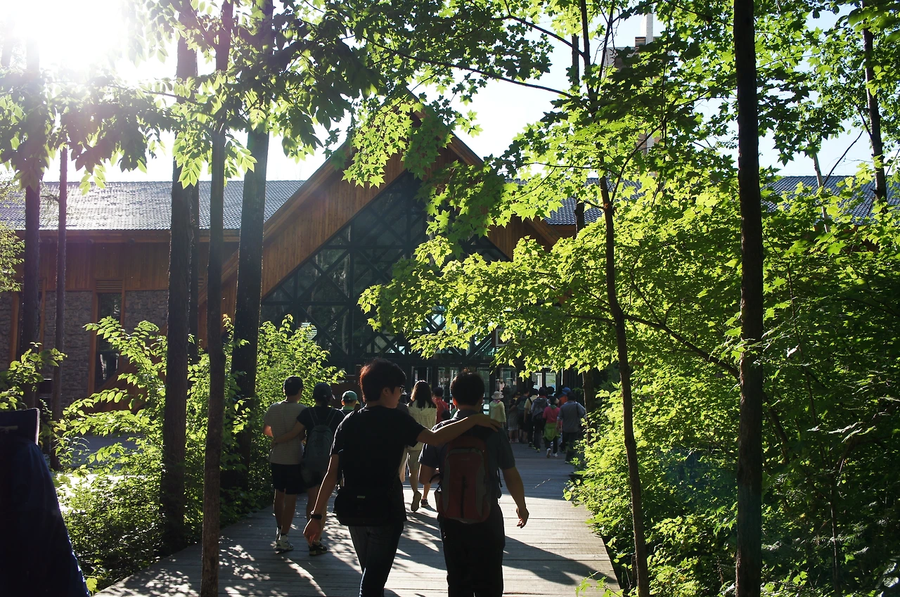 인솔자를 따라 나무 데크를 걷다 보면 다시 주차장이 나온다. 백두산 공원 내에서만 운행하는 셔틀버스 정류장이다.