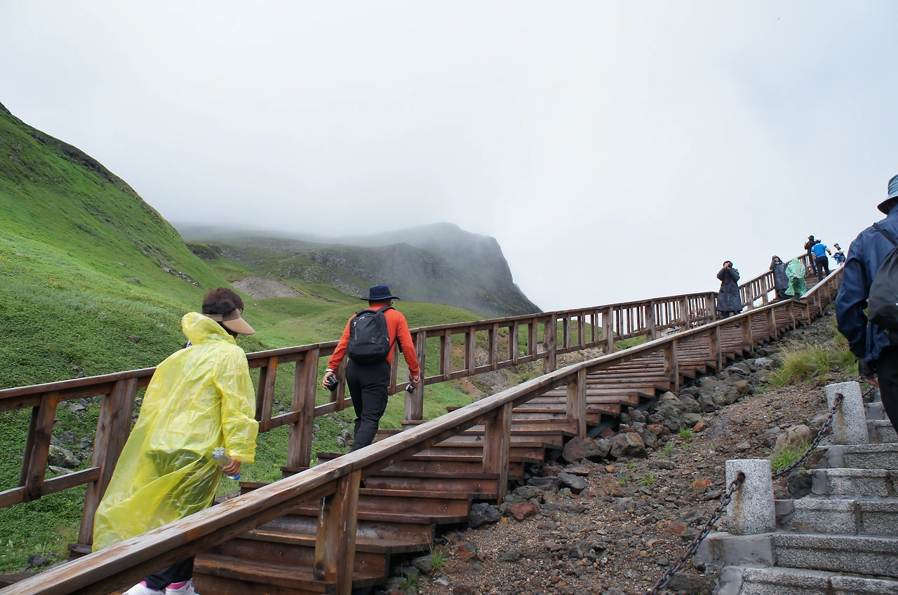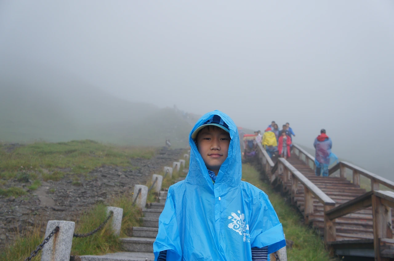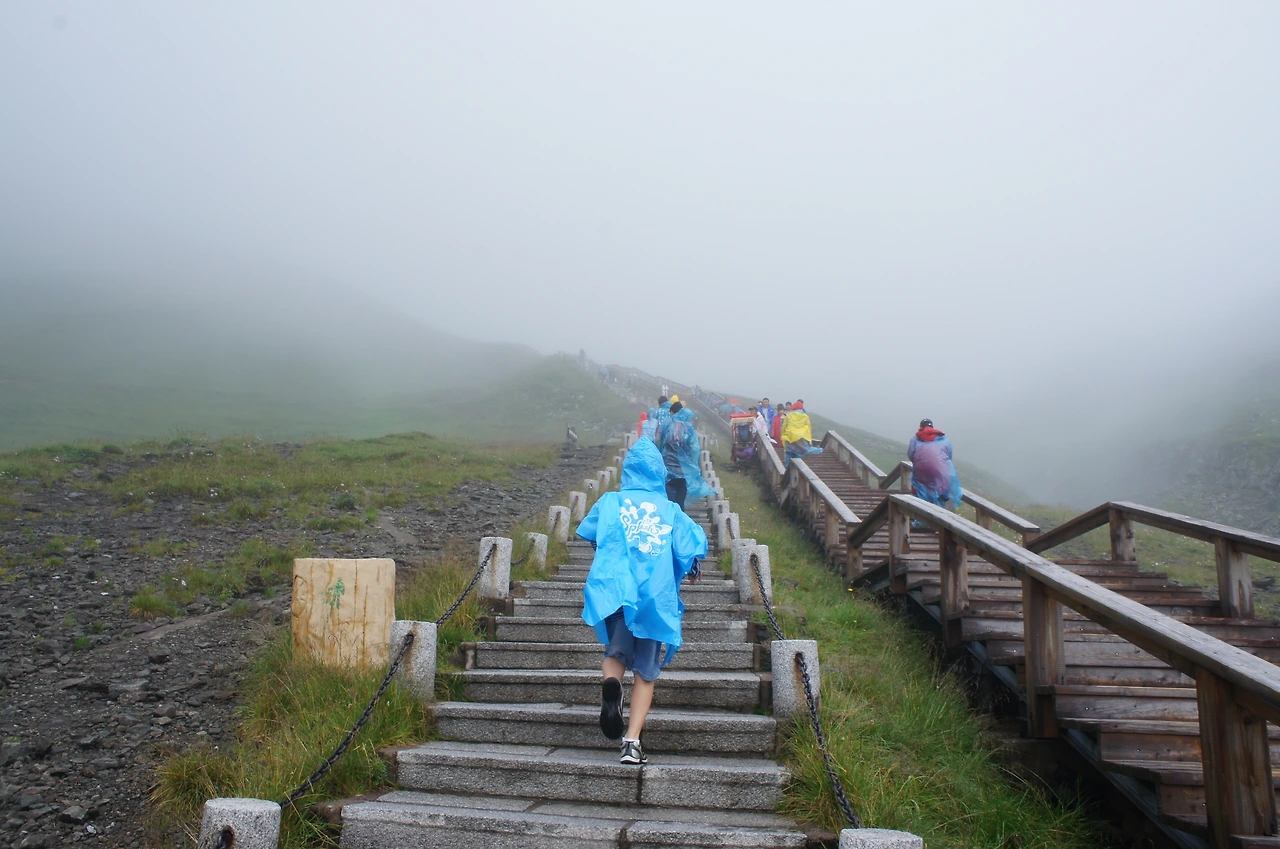 자, 이제 천지에 올라갈 일만 남았다. 비가 부슬부슬 오는 탓에 모두 비옷을 입고 계단을 오르기 시작한다. 1442개의 계단을 올라가야 하는데 약 30~40분 걸린다고 한다.