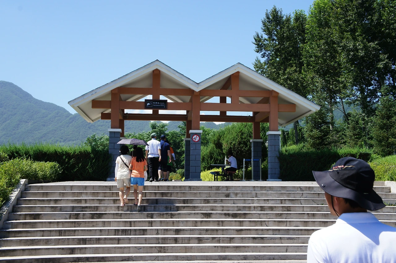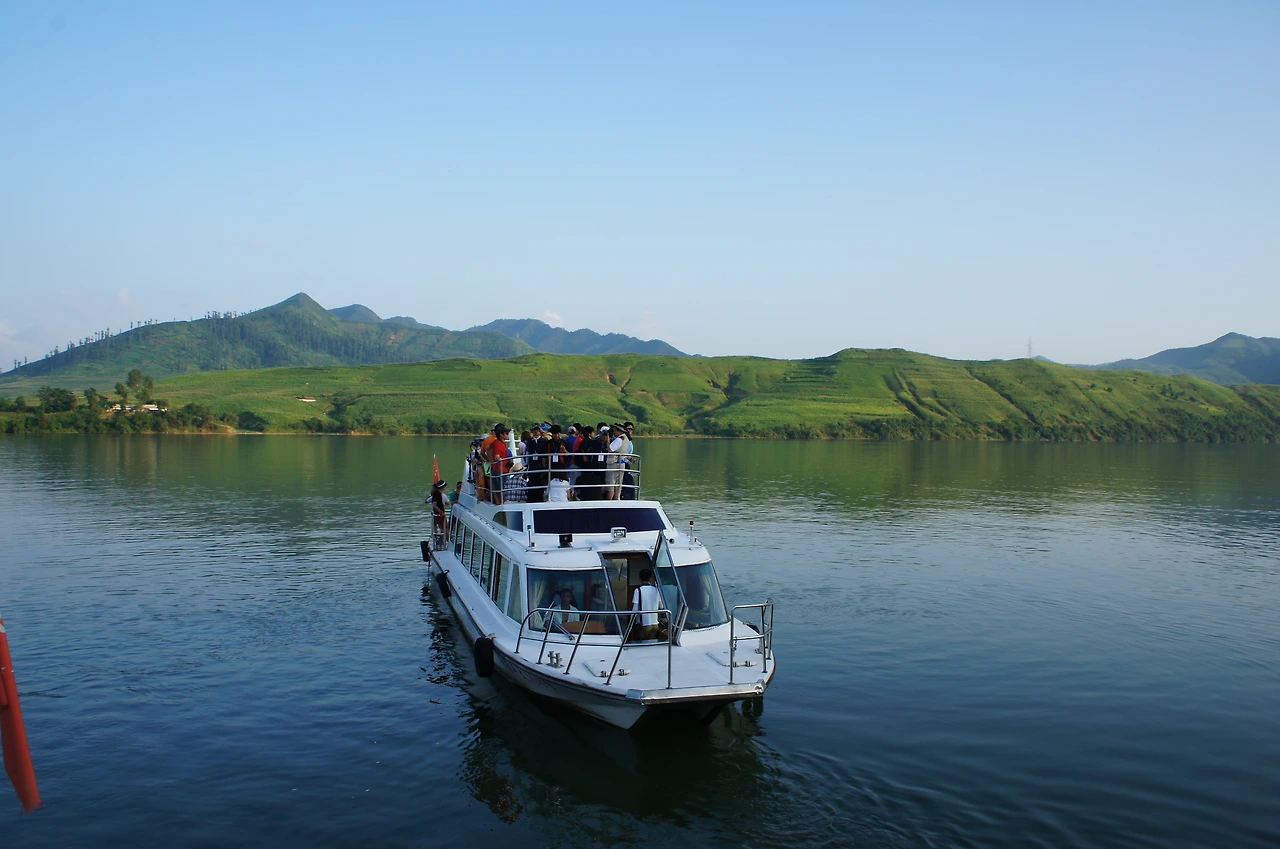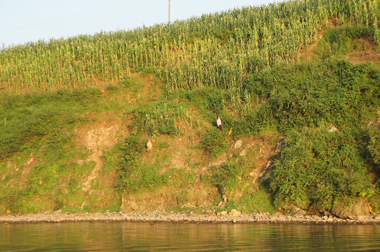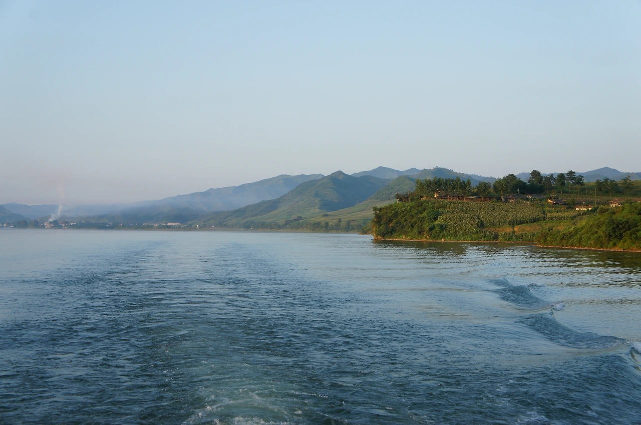 고구려 적석총 관광을 마치고 오늘 마지막 일정을 소화하기 위해 압록강 쪽으로 향했다. 보트를 타고 북한을 좀 더 가까이 볼 수 있는 스페셜 투어가 준비되어 있다. 압록강 건너편에 보이는 것이 북한 땅인데 자세히 보면 산에 나무가 거의 없이 풀만 자라고 있는 희한한 모습이다. 관광 가이드에게 물어보니 겨울에 땔감이 없어 나무를 베어 땔감으로 쓰다 보니 나무가 없어지고, 떨어지는 낙엽이 없어서 산이 황폐화되어간다고 하였다.