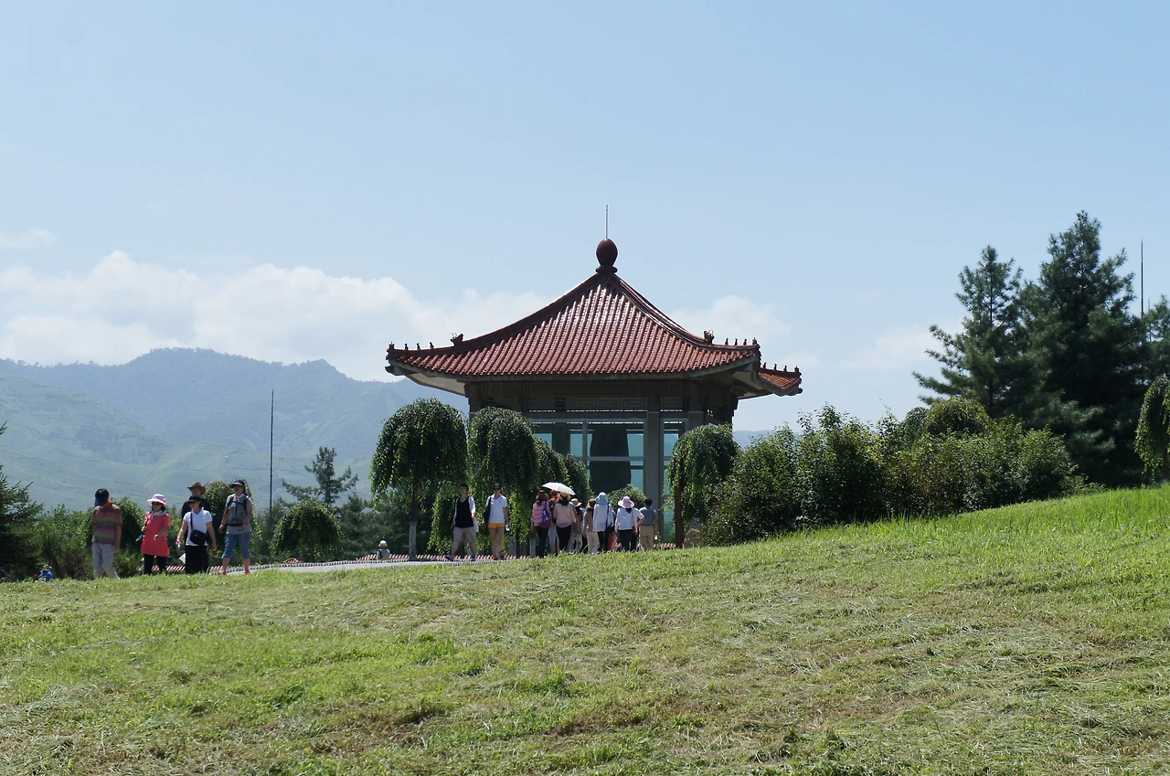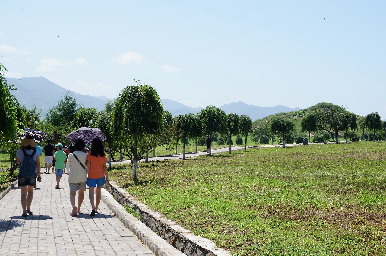 내부에서는 사진을 찍지 못하게 하는 바람에 밖에 나와 기념사진을 남겨본다. 이제 서쪽으로 200미터 정도 떨어져 있는 광개토대왕릉으로 간다. 잘 닦인 산책로를 따라서 가다 보면 저 앞에 작은 언덕처럼 보이는 것이 바로 광개토대왕릉이다.