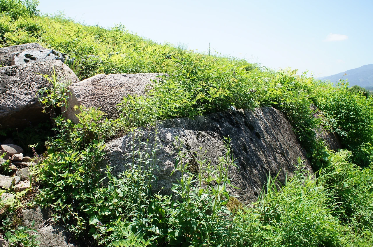 잡초가 무성하여 자세히 볼 수는 없지만 이렇게 거대한 돌이 아래쪽을 받치고 있는 것을 보면 대왕릉 비임에 틀림없다.