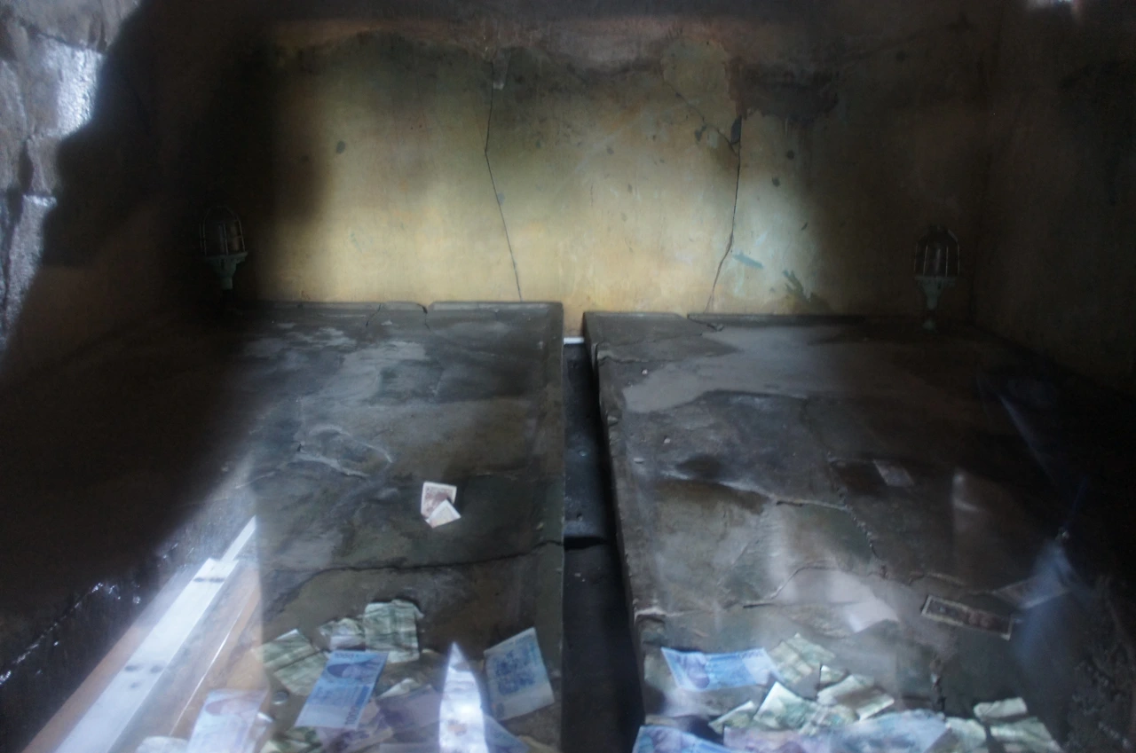 대왕릉이 상단부에는 작은 방이 하나가 있는데 입구를 투명한 플라스틱 창으로 막아놨다. 내부를 들여다보면 직사각형의 큰 돌 두 개가 있는데 이것은 아마도 대왕과 대왕비를 합장한 것으로 보인다. 석실 내부가 어둡고 플라스틱 창으로 막혀있어서 벽화나 내부 장식을 보기 어려웠지만 누가 던지고 갔는지 중국 지폐와 한국 지폐들이 어지럽게 널려있다. 복을 빌며 동전이나 지폐를 던진다고 하나 대왕릉에 천 원짜리 지폐나 동전 등을 던져 너무 지저분하게 해 놓아 안타깝다는 생각이 들었다.