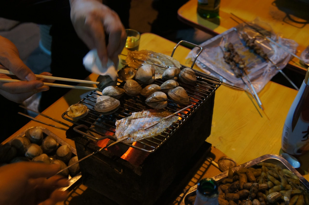 식사를 마치고 다시 버스를 타고 한참을 달려 단동 숙소에 도착했다. 중국에서의 마지막 날이라 친해진 일행들끼리 밖으로 나와본다. 어둑어둑한 밤거리, 좀 무섭긴 했지만 현지 가이드와 경험이 많은 한국 인솔자가 있어서 든든했다. 호텔 근처 골목에 꼬치구이와 맥주를 파는 노점상이 있는데 그곳에 자리를 잡았다.