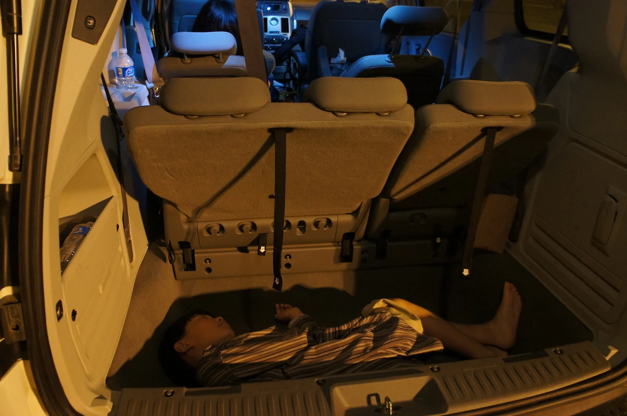 아침부터 저녁까지 정말 신나게 놀았다. 이제는 숙소로 돌아가야 할 시간이다. 숙소로 돌아가야 하는데 넓고 넓은 뒷자리를 마다하고 한사코 트렁크에서 눕겠다는 둘째 녀석의 소원(?)을 들어줘 본다.