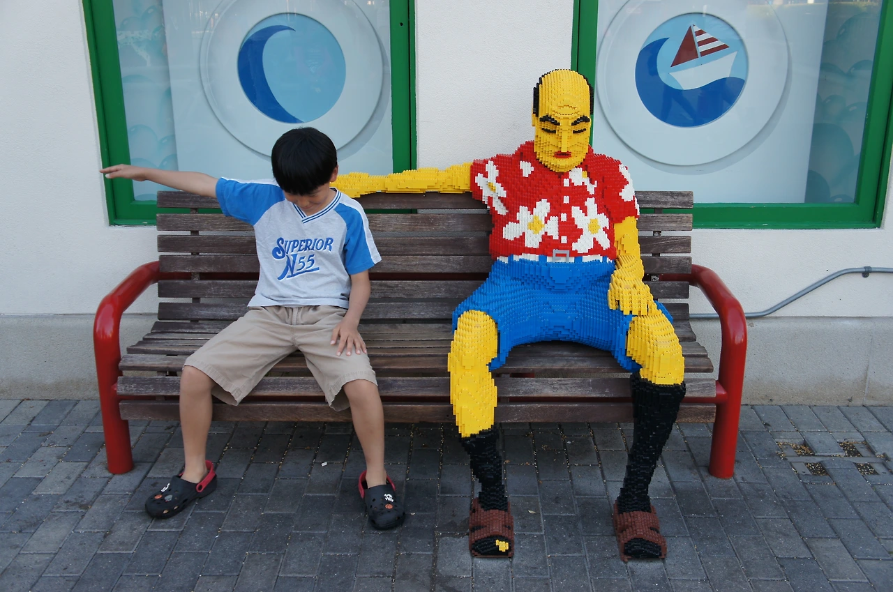 자, 이제 레고랜드로 출발~! 주차를 하고 놀이공원 입구로 가는 도중에 발견한 레고로 만든 조형물. 아이와 아빠의 표정 속에서 이곳이 아이들이 얼마나 즐거워하는 놀이공원인지 느낄 수 있다.