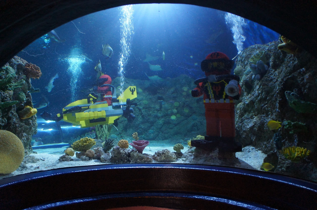 여느 수족관과 다름없이 물고기들이 헤엄치고 있는데, 자세히 보니 레고로 만든 잠수함과 잠수부가 있다. 수족관의 주인공은 물고기가 아니라 레고다.
