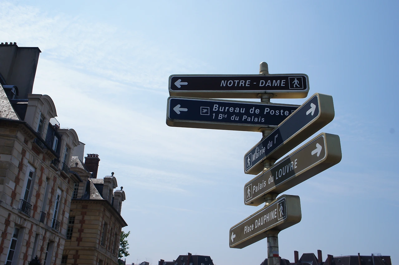 파리에서는 흔하디 흔한 도로 표지판이긴 하지만 처음 여행 온 관광객이 보는 표시판은 멋스럽기까지 하다. 파란 하늘과 잘 어울린다.