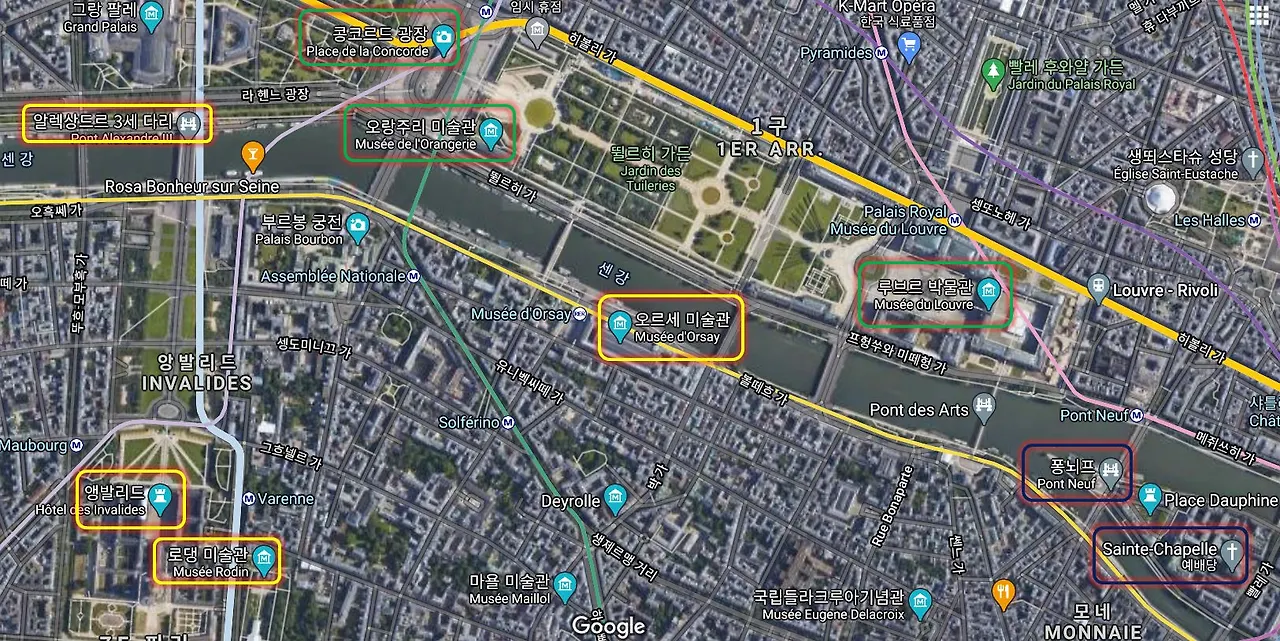 구글 지도에서 보면 주요 관광지가 중심가에 모여있는 것을 볼 수 있다. 우리 가족이 어제 방문했던 퐁네프다리, 셍샤펠 성당은 파란색 박스로, 오늘 방문해야 하는 곳들인 오르세 미술관, 로뎅 미술관, 앵발리드 군사박물관, 알렉상드르 3세 다리는 노란색 박스로, 나중에 방문할 곳들은 초록색 박스로 표시해 보았다.