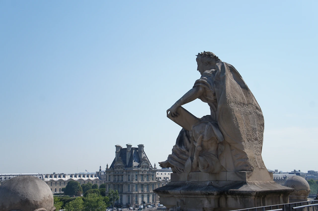 옥상으로 나가보면 이렇게 주변의 경치를 둘러볼 수 있는 휴식 공간이 나오는데 세느강 건너 루브르 박물관 일부가 보인다.