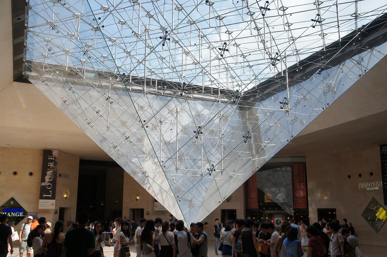 이렇게 루브르 관람을 마치고 다시 왔던 곳으로 돌아오면 피라미드 아래가 나온다. 위로 올려다보는 하늘도 예쁘다.