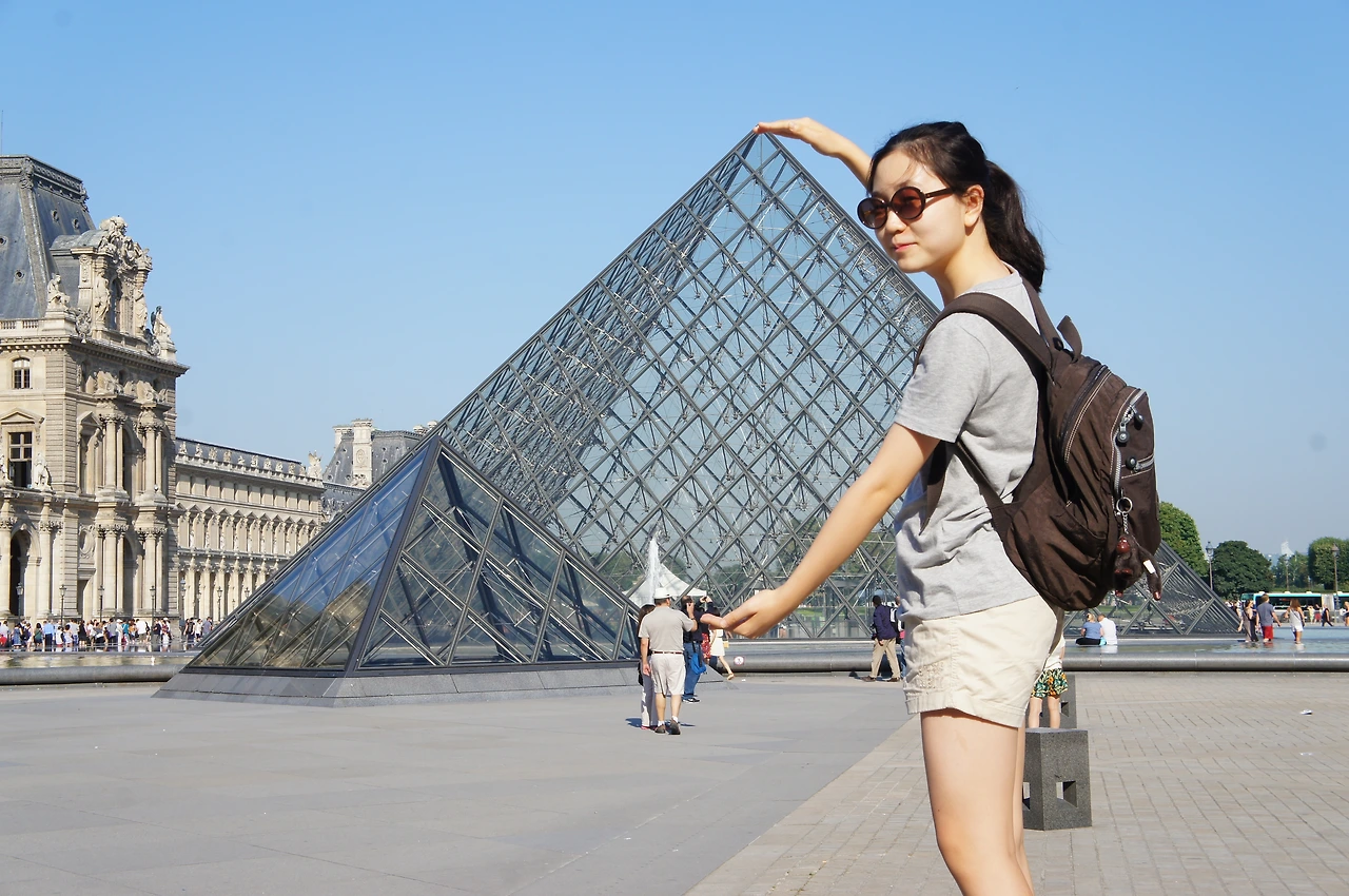 루브르의 상징처럼 되어버린 피라미드형 조형물 앞에서 발걸음을 멈추고 사진을 남긴다.