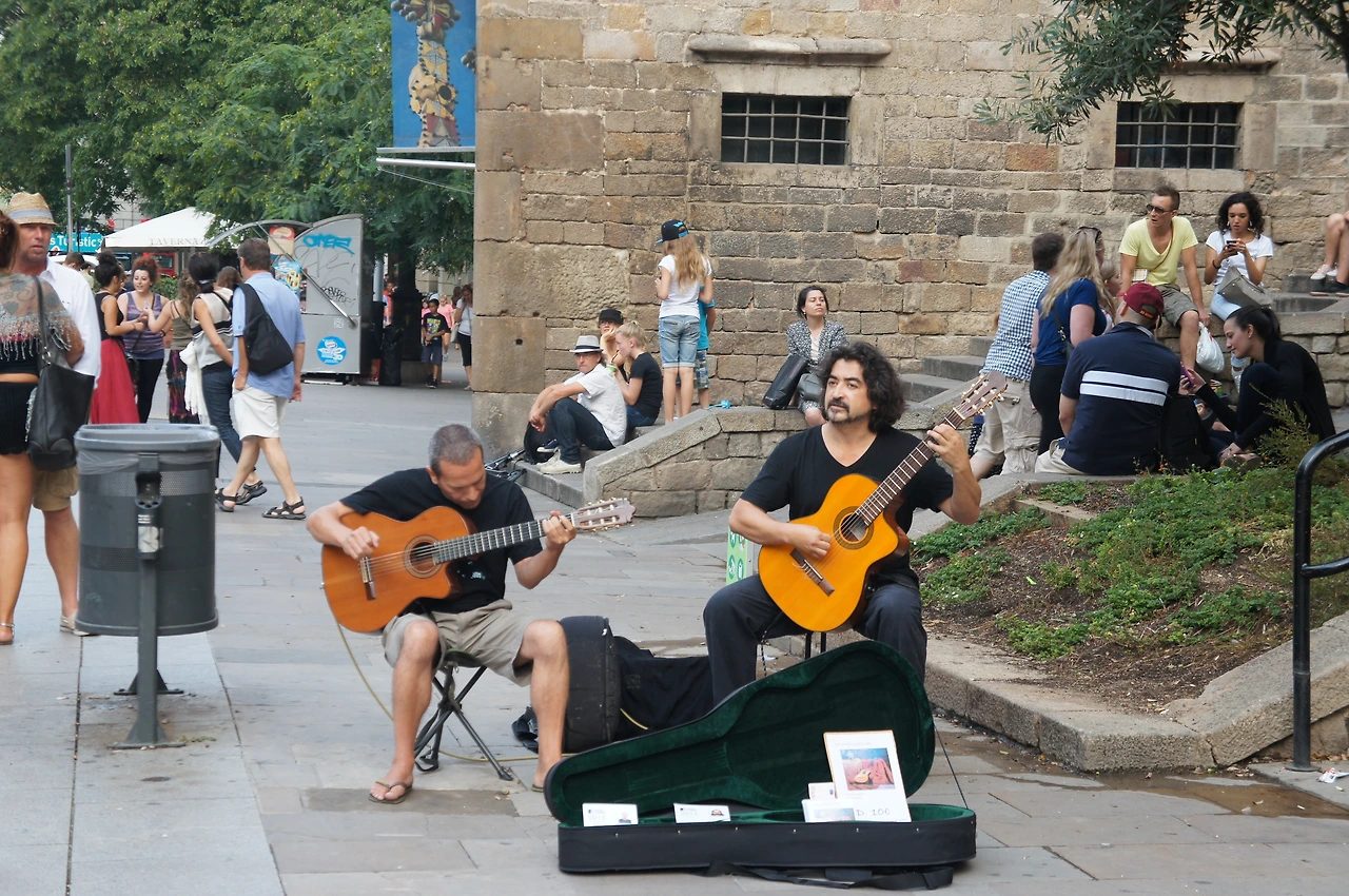 연주가 끝나자 구경하던 관광객들이 박수를 치고, 어떤 이는 동전이나 지폐를 기타 케이스에 넣어준다.
