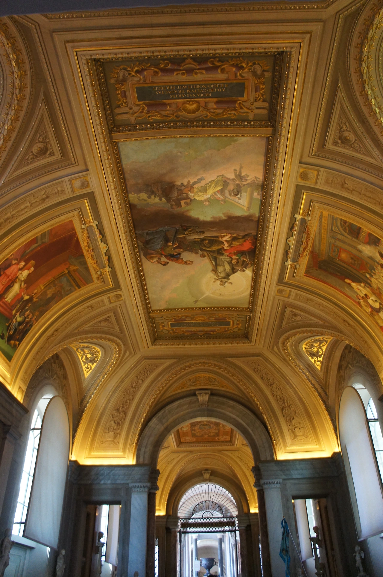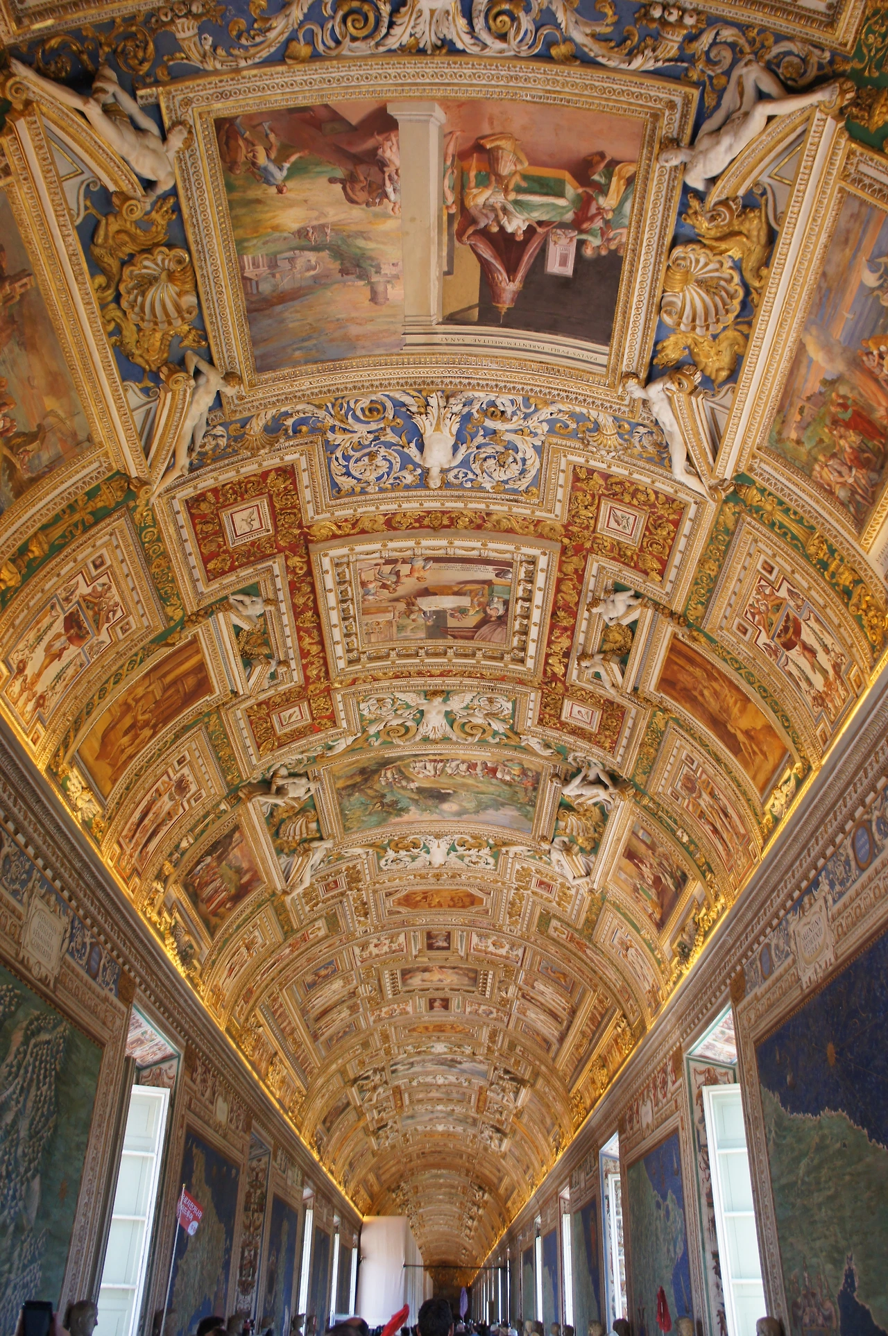 다음에 나타나는 지도의 회랑은 이탈리아의 중요한 성당들이 있는 40개의 지도가 프레스코화로 그려져 있는 곳이다. 1480년에서 1585년 사이에 그려진 그 시대의 지도로서 수많은 화가들이 의무적으로 번갈아가며 작업을 했다고 한다. 벽에 그려진 지도는 별로 감흥이 없었으나, 천정이 너무 화려해 눈을 뗄 수가 없다. 아 목아퍼라~