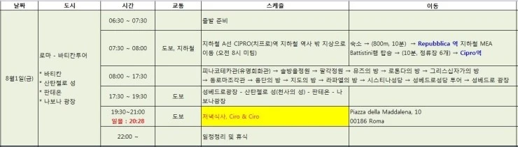 숙소에서 10분 정도 걸어가 Repubblica역에서 지하철을 타고 10분 정도 가면 Cipro역이 나온다. Cipro역 근처에서 투어가이드와의 미팅이 예정되어 있다. 6시 30분에 일어나, 짐을 챙기고 아이들을 서둘러 깨운 후에 숙소를 나선다.