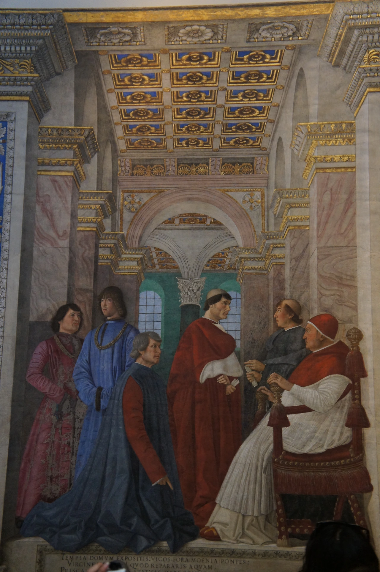 4호실로 들어서면 멜로쪼 다 포를리(1438~1494)의 대표적인 작품들을 볼 수 있는데 바로 아래의 그림이 "바티칸 도서관 제막식을 거행하는 식스투스 4세"라는 작품이다. 모든 인물들이 엄격하게 구성된 배경 안에 그려져 있고, 천정은은 붉은색 격자무늬, 도금된 조형과 로베레 나무의 화관으로 장식되어 있다.