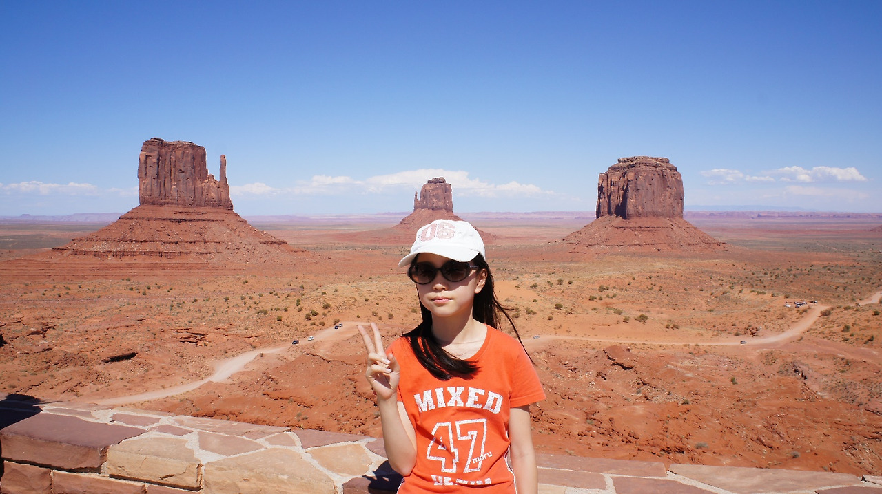 공원 내 주차장 바로 근처에 각종 기념품을 파는 비지터 센터가 있고, 테라스로 나가보면 모뉴먼트 밸리를 한눈에 내려다볼 수 있는 멋진 뷰 포인트가 있다. 테라스에서 내려다보니 눈 앞에 펼쳐지는 엄청난 스케일에 입이 다물어지지 않는다. 그랜드캐니언이 푹 꺼진 지형으로 사람을 놀라게 한다면 여기는 불쑥 솟아올라 놀라게 하는 곳이랄까. 비포장도로를 자세히 보면 작은 차가 달리고 있는 것을 볼 수 있는데, 저 세 개의 바위산이 얼마나 큰지 가늠할 수 있다.