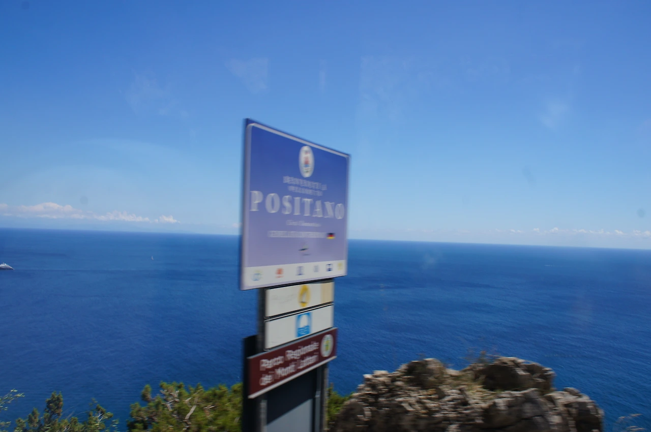 포지타노를 알리는 표지판이 카메라에 잡히는데 셔터속도가 느려 흐리게 나왔다.