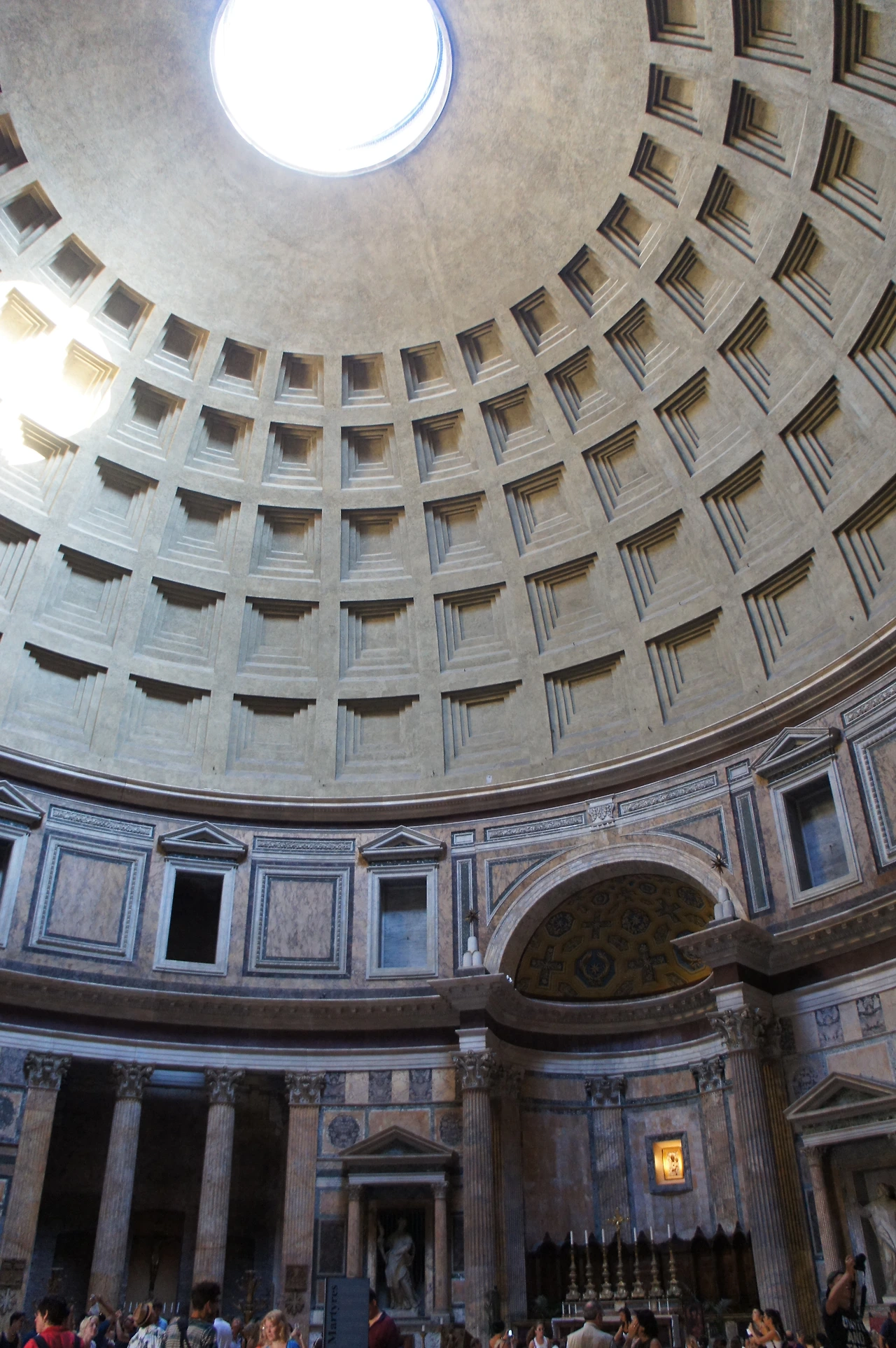 판테온 내부로 들어가면 한가운데에 저렇게 구멍이 뚫려 있고, 그 구멍을 통해 햇빛이 내부로 들어온다. 조명이 따로 없어도 환하다. 비가 오는 날에는 빗방울이 아래로 떨어진다고 하는데 조용한 판테온 내부로 떨어져 그윽하게 울려 퍼질 빗방울 소리가 궁금하다.