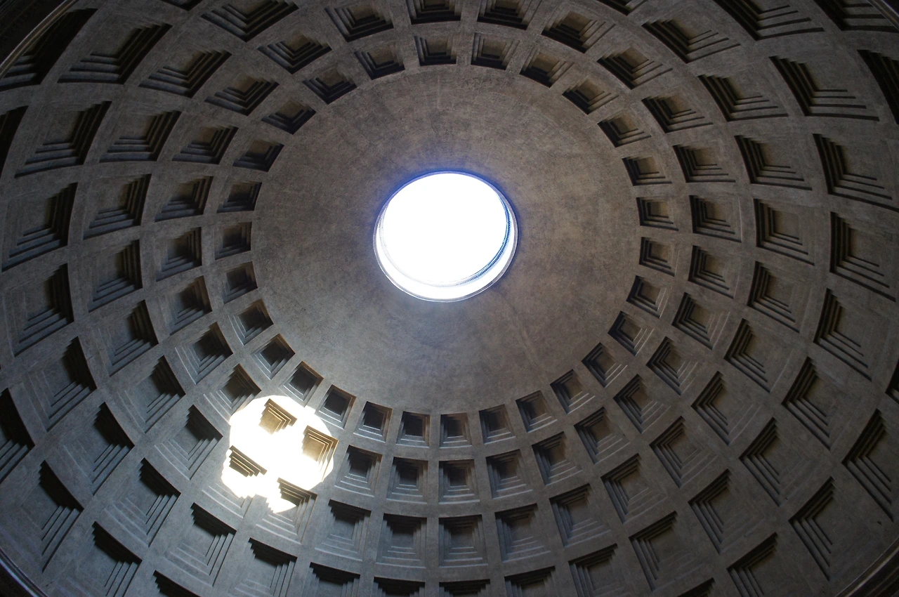 이 판테온은 단순해 보이지만 미켈란젤로도 격찬한 치밀한 설계로 이루어져 있다. 돔은 건물 전체 높이의 정확히 반을 차지하고 있으며 내부 원의 지름과 천정의 높이는 똑같이 42.3m로 균형을 이룬다. 기둥 없이 두께 6m의 벽체만으로 받쳐져 있고 무게를 줄이기 위해 위로 갈수록 벽의 두께가 얇아지고 있다.