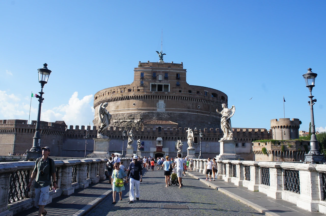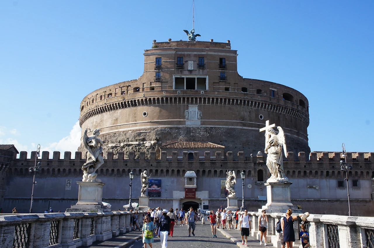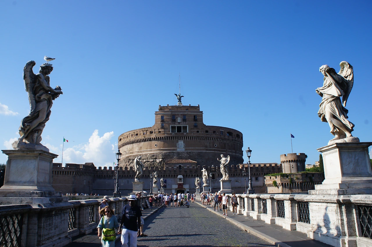 성 베드로 광장에서 10여분을 걸었을까? 우리의 첫 목적지 산탄젤로 성(천사의 성)이 나온다. 원래는 황제의 묘로 사용하기 위해 135년에 지어졌다. 509년, 로마를 휩쓴 흑사병 퇴치를 위해 행진을 하던 교황 그레고리오 1세가 성 꼭대기에 나타난 대천사 미카엘을 목격하였다고 한다. 그 후 흑사병이 없어지는 기적이 일어났으며, 성의 꼭대기에 대리석으로 천사의 상을 만들고 천사의 성이라 불리게 되었다고 한다.