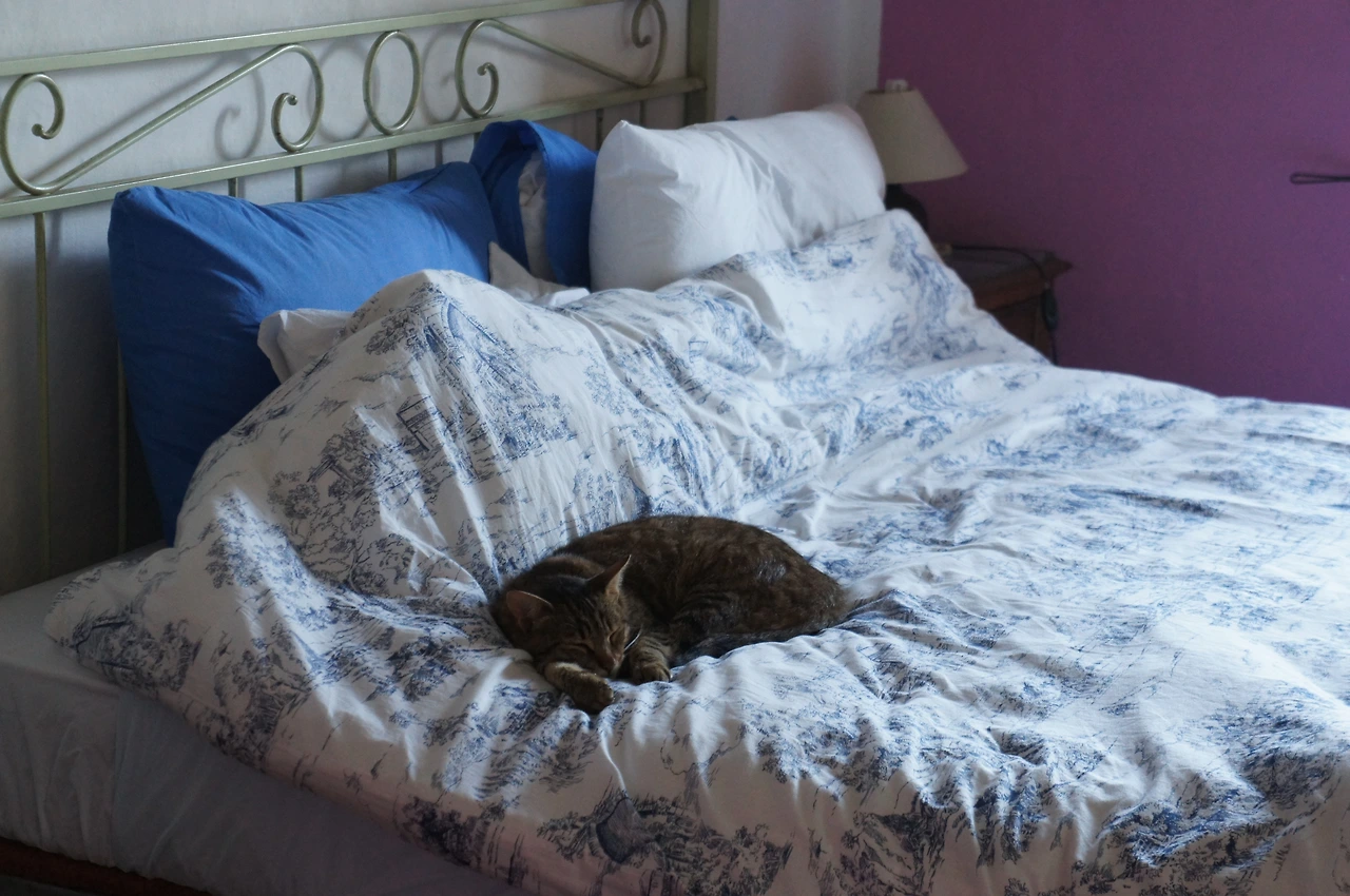 아니 이 녀석은! 아까 아침 먹으러 나갔을 때 봤던 고양인데 냉큼 침대 위에서 잠을 자고 있는 게 아닌가.