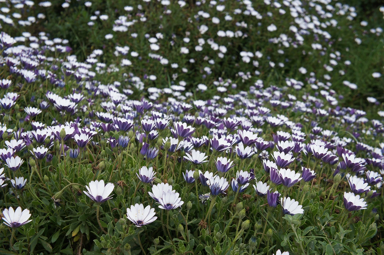 주차장에 피어있는 이름모를 꽃들. 꽃잎 아래는 보라색, 위쪽은 흰색이다.