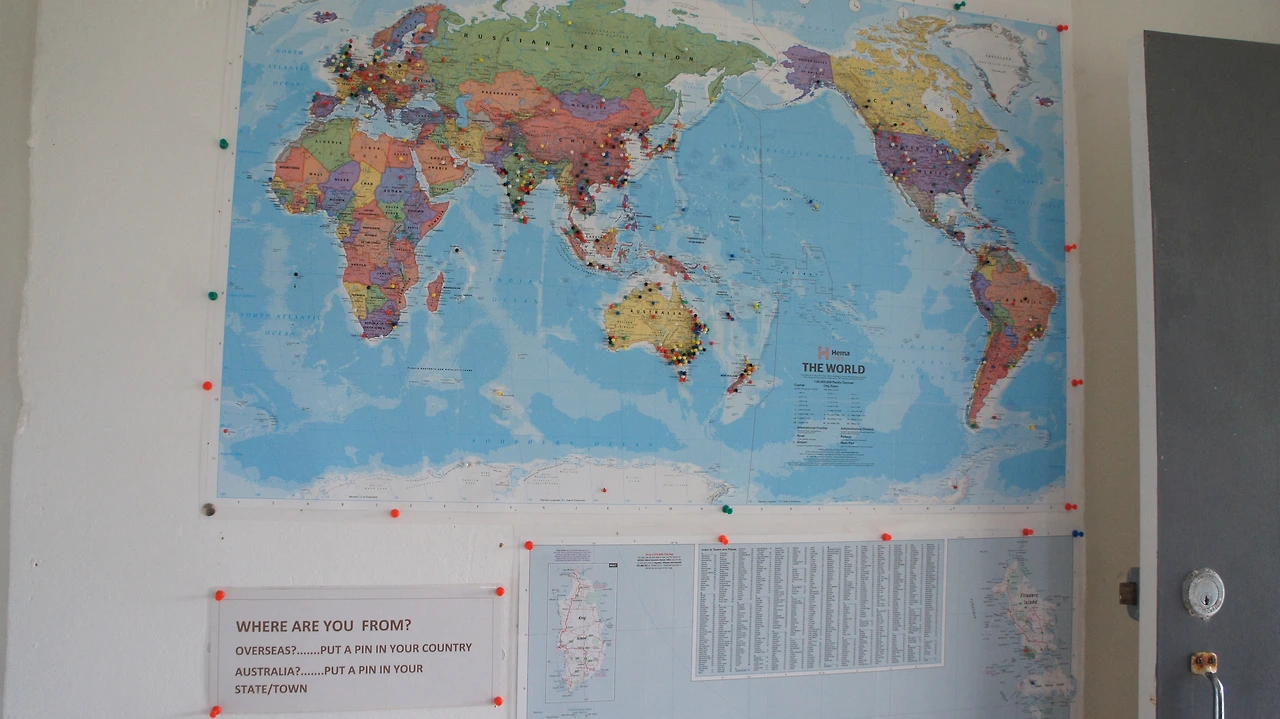아래쪽을 보니 관광객들에게 어디서 왔는지 핀으로 표시해 달라는 문구가 보인다. 세계지도에 꽂힌 많은 핀들은 관광객들이 꽂아놓고 간 것이구나...