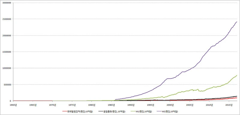 한국 경제가 성장했기 때문에 당연히 돈의 양은 늘어났지만 돈이 늘어나는 속도인 기울기가 상당히 급격하게 증가하고 있는 것을 알 수 있습니다.