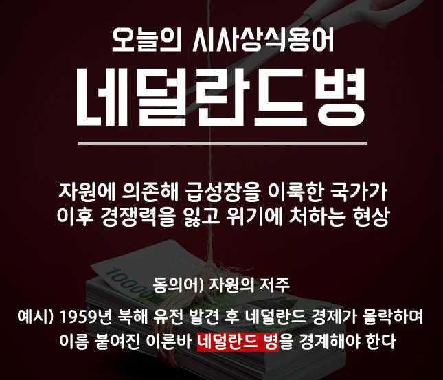 결국 자원 수출로 인해서 자국의 통화가 강해지면서 제조업이 상대적으로 약해져서 발생되는 현상을 말한다.