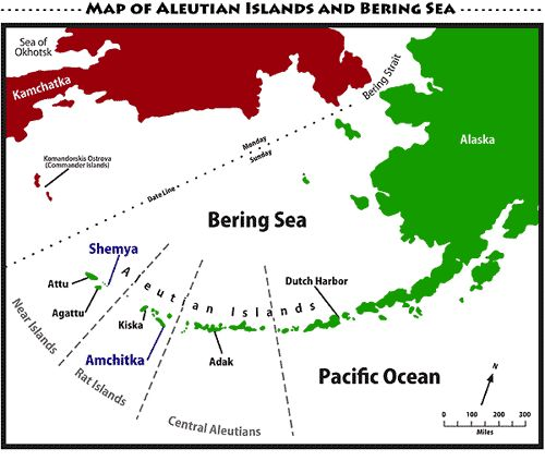 알류샨 열도는 시베리아 캄차카반도와 알래스카 사이에 있다. 약 2,000km에 걸쳐 화산섬들이 줄지어 활 모양으로 이어져 있다. 알류샨 열도는 베링해와 태평양을 나누는 벽이다. 알류샨의 북쪽 바다 베링해는 북극해에서 내려온 물이라 차다. 그러나 알류샨 열도의 남쪽 바다는 적도에서부터 올라오는 북태평양해류로 아직 따뜻하다. 그래서 알류샨은 가장 추운 1월 평균 기온은 영하 2°에 그친다. 서울의 1월 평균 기온은 영하 6°다. 알류샨은 화산섬이다. 뜨거운 온천수가 사방에서 솟으니 한겨울에도 눈이 쌓이지 않는 곳이 많다. 알류샨은 생각처럼 추운 곳이 아니다. 시베리아나 알래스카와는 다르다. 북쪽에 있으니 여름 기온도 높이 올라가지 않는다. 지구과학자들은 베링해 가까운 알류샨 어느 섬에서 영상 50° 가까이에서만 살 수 있었던 곤충 화석을 발견했다. 베링해는 추운 곳이 아니었다는 증거다. 오히려 한때는 뜨거운 곳이었다. 알류샨 열도의 섬과 섬은 보통 30~40km 떨어져 있다. 가장 긴 거리도 100km가 채 되지 않는다. 북태평양 난류는 일본 열도를 지나 오호츠크해 옆 쿠릴열도를 스쳐 올라온다. 알류샨을 따뜻하게 보온해 주는 북태평양 난류는 캐나다 태평양 해안으로 흘러 멕시코 바하칼리포르니아까지 내려간다.