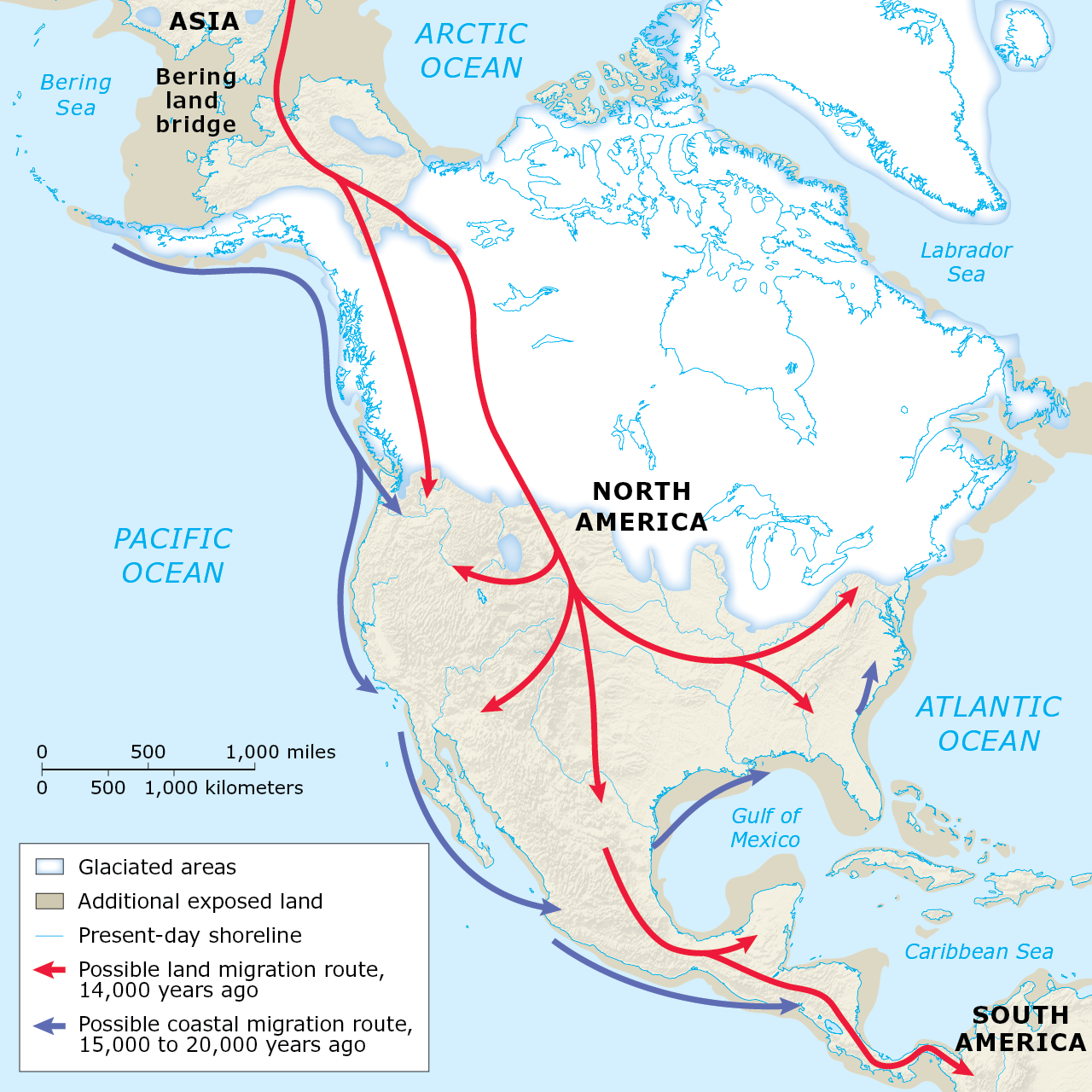 지구가 더워졌다. 빙하가 녹고 있었다. 지구 온도가 올라가고 빙하가 녹고 수면이 상승했다. 베링해협은 50°에 가까웠다. 50° 가까운 온도에서만 살 수 있었던 딱정벌레 종 화석이 시베리아와 알래스카에서 발견되었다. 베링해는 봄이 되면 키 낮은 풀에서 핀 작고 붉은 꽃송이가 지천에 널리 피었다. 믿기지 않겠지만 알프스 산등성이와 비슷한 풍경이었다고 지구과학자들은 말한다. 사람이 걷기에 좋은 길이었다. 연륙교는 나비와 벌이 날았다. 따스하고 평화로운 길이었다. 학자들은 이 땅을 베링지아Beringia라 또는 베링육교라고 부른다. 동북아시아의 신석기인들이 베링육교를 건너 알래스카를 건넜다. 태양이 뜨는 환한 동으로 갔다. 북극성을 보고 방향을 잡았다. 북과 남, 동과 서를 잘 알 수 있었다. 알래스카에서는 별 어려움이 없었다. 얼음이 녹아 알래스카 입구에서 시작해 미국 국경 근처까지 알래스카 전체를 관통해 흐르는 유콘강에 들어서기만 하면 그 강을 따르면 되었다. 오히려 캐나다 땅에 들어서면서부터 어려움이 시작되었다. 그때 캐나다는 수천 미터 두께의 큰 빙하 2장이 연결되어 뒤덮고 있었다. 빙하가 녹기 시작할 때 연결부위가 먼저 녹기 시작했다. 녹은 빙하 물은 남북으로 강을 만들어냈다. 캐나다 로키산맥 동쪽 사면을 따라 난 두 줄기 유콘강 계곡은 좁고 긴 회랑이 되어 먼 길 걷는 신석기 여행자들을 위해 길을 열어주었다. 유콘강은 남으로 흘러 캘거리Calgary가 있는 남부 앨버타로 흐른다. 빙하가 만들어놓은 회랑으로 들어간 등짐 봇짐 진 나그네들은 물 따라 흘러 캐나다 로키산맥 동쪽 사면을 지나 빙하 회랑의 출구인 에드먼턴에 닿았다. 길고 긴 빙하 길이 끝났다. 따뜻한 이곳은 동식물이 풍부했다. 거대한 빙하 사이를 지나온 동북아시아인들. 큰 배낭을 메고 긴 여행이 끝나고 막 터미널에 내린 여행자들 같은 기분이었을 테다. 캐나다 에드먼턴이 그 회랑의 터미널이었다. 지금의 미국 땅으로 들어섰다. 그리고 이리저리로 흩어졌다. 빙하기 이후의 아메리카에 도착한 동북아시아인들. 이들이 신대륙의 주인들이었다. 이 빙하 회랑이 생긴 지 700년밖에 지나지 않았을 때 멕시코에는 벌써 많은 사람이 군집해서 살았다. 그 흔적을 간직한 대형 유적지가 발굴되었다. 멕시코의 대형 마을 유적지가 만들어진 지 1,000년 만에 칠레 땅끝 파타고니아에도 사람들이 도착했다. 1년에 13km씩 내려간 셈이다. 아메리카에서는 벌써 동아시아에서 건너온 열정적이고 도전적이며 강인한 근성의 사람들이 여기저기 흩어져 작은 마을을 만들어 번성하고 있었다. 아직 유럽대륙은 남유럽을 제외하고는 빙하에 뒤덮인 채였다. 고대 이바르 또는 밝족이 중부 유럽을 덮은 빙하 남쪽 선을 따라 이베리아에 들어가기도 전의 일이었다.