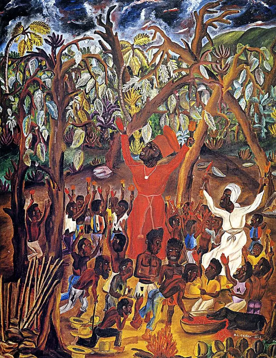 여러 곳에서 끌려온 생 도맹그의 흑인들은 언어, 풍습, 종교 같은 것에서 서로 통하는 것이 없었다. 비록 노예의 삶일지라도 공동체 생활을 그렇게 할 수는 없는 일이었다. 곧 죽을 신세이니 종교는 특히 중요했다. 다호메이 지역 출신이 가장 많았으므로 다호메이가 노예 사회에서 종교를 주도했다. 세네갈, 나이지리아의 적도 북쪽의 종교와 콩고, 앙골라의 중앙아프리카 전통 종교가 혼합되었다. 민족적으로는 요루바족, 폰족, 콩고족 등이다. 이들 노예의 주인은 프랑스인이다. 코드 누아르에 의하면 프랑스 노예주는 노예들을 가톨릭으로 개종할 의무가 있었다. 그러므로 로마가톨릭과 프리메이슨도 재료로 들어갔다. 종교에는 조물주가 필요한 법이다. 이들도 자신들을 창조한 태초의 조상신을 단Dan이라고 불렀다. 카리브 노예들이 다호메이와 콩고 출신들 주도로 아프리카 여러 지역과 다이노, 로마가톨릭까지 주변에 있는 모든 종교적 재료를 쓸어 모아서 창조주 단Dan을 섬기는 아프로-카리비안 종교 부두vodou교를 스스로 만들어냈다. 춤과 종교의식도 다호메이 스타일을 따랐고, 다른 지역 출신 노예들이 그것을 따라 했다. 부두Vodou교는 아프리카의 종교와는 달랐다. 아프리카 종교에는 사당이나 제실의 개념이 없다. 이런 것은 다이노들의 종교문화다. 부두교는 다이노들처럼 제실을 설치하여 신을 숭배하는 제의를 올렸다. 무당을 중심으로 제의가 진행되는데 북을 치고 노래하고 춤을 추었다. 남자 무당을 웅간oungan, 여자 무당을 만보manbo라고 했다. 그들의 신은 조물주이기도 했고, 죽은 조상이기도 했다. 이들에게 바치는 제상에는 과일과 술이 올라갔고, 동물을 잡아 희생 제물로 제사상에 바쳐졌다.
