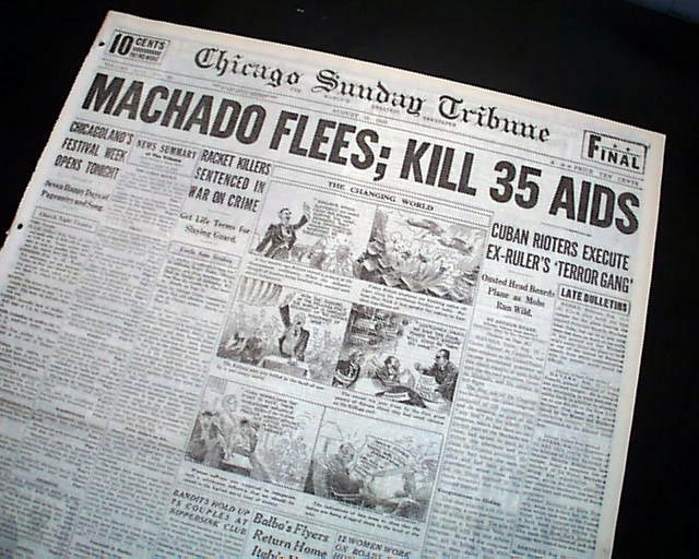 기뻐하는 시민들이 거리를 메우고 실탄을 장전한 시민군은 프라도 대로를 행진했다. 기쁨과 분노는 약탈로 변해 마차도에 협조해 권세를 누린 자들의 집을 파괴하고 불을 질렀다. 권세를 부린 자들 천 명 이상이 재판 없이 살해당했다. 마차도의 비밀경찰 수장은 프라도 대로에서 약국 앞을 지나다 총에 맞아 죽었고, 총에 구멍이 숭숭 뚫린 시체를 승리한 시민들이 대로에 전시했다. 시신을 실은 자동차들이 거리를 돌며 승리를 증명했다. 머리는 광장에, 몸은 그의 부모의 집 대문 앞에 내걸린 시체도 있었다. 대통령 궁에 난입한 군중들은 이제 이 집은 민중들의 것이라고 외치며 물품을 들고나갔다. 무능력했던 임시직 대통령 세스페데스의 호화로운 저택도 목표물이 되었다. 폭동은 공산주의자들과 아나키스트들이 주도했다. 미국에서 텔레비전이 이제 막 보급되고 있을 때였으므로 NBC, CBS 같은 신생 TV 방송사들에 이보다 텔레비전에 적합한 ‘그림’은 있을 수 없었다. 미국 방송만 보면 쿠바는 지금 흑인들이 일으킨 인종 폭동에 휩싸여 있었다. 흑백이었지만 피 흘리는 아바나 현장을 실감 나고 생생하게 촬영한 영상을 송출할수록 브라운관 텔레비전도 잘 팔렸다. 흑인과 아나키스트, 공산주의자들에 대한 탄압을 주도했던 산티아고 시장의 저택도 약탈당하였다. 바하마를 거쳐 마이애미 비치에서 마차도는 쿠바가 공산주의자들의 폭동에 넘어갔다고 주장했다. 공산주의는 미국인들이 가장 두려워하는 단어였다. 우익 성향의 ABC방송도 마차도의 주장대로 공산주의자들의 폭동으로 마차도가 쫓겨났다고 보도했다. 마차도는 마이애미에서 69세에 사망했다. 독립 전쟁 지도자 가운데 가장 젊은 장군이었던 그는 많은 국민의 지지 속에 통치를 시작했지만 부패했고 미국의 이익을 이용해 권력을 사유화했다. 쿠바 국민이 그런 그를 축출했고, 미국의 호수 안에 떠 있는 악어를 닮은 섬이 공산화할 것을 걱정한 미국이 마침내 그를 버렸다.