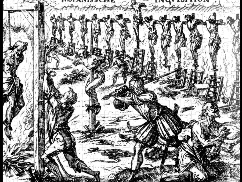 페르디난드가 카스티야 여왕의 남편이 되었을 때 심문은 새롭고 강해졌다. 과정과 절차, 기소 이유 같은 것도 필요하지 않았다. 이전의 심문과는 가톨릭 사제들이 효과적인 심문을 위해 물고문, 통닭구이 같은 고문 도구를 활용했다는 점에서 큰 차이가 있었다. 관 뚜껑에는 사람의 두 눈과 심장을 찌르도록 고안된 쇠꼬챙이가 박혀있었다. 재판에 부쳐진 사람을 관에 가두고 관 뚜껑을 덮고 못을 박으면 관 뚜껑에 해부학적으로 고안된 못이 그 안에 있는 사람의 눈과 심장에 구멍을 내서 고통을 겪으며 서서히 죽어가도록 만들었다. 고문을 당하는 자가 빨리 죽는다면 그것은 너무 자비로운 일이었다. 관 뚜껑에 박힌 대못은 급소를 피해 그 주위를 찌르도록 고안했다. 그 고문 도구의 이름이 거룩하게도 ‘철의 성모 마리아’였다. ‘유다의 의자’도 있었다. 예수를 배신한 유다를 심문하는 이 의자는 피라미드 모양의 꼭대기 뾰족한 곳에 혐의자를 항문이나 질이 위치하도록 앉힌 후 서서히 몸을 묶은 줄을 풀어주면 몸의 무게로 천천히 몸속을 파고들도록 고안된 도구다. 수레바퀴에 사지를 결박하고 쇠막대기나 망치로 내리쳐 뼈를 부수고 불에 달군 인두로 심장을 지졌다. 자비를 베풀 때라면 칼로 목을 내리기도 했다. 여성의 질에 종 모양처럼 넓게 퍼진 쇳덩이를 집어넣어 강제로 벌려 찢는 도구도 있었다. 가마솥에 사람을 넣어 삶아 죽였다. 몸을 벗겨 횃대에 묶었다. 사람들은 몰려들어 묶인 남녀의 성기를 만졌다. 포경은 유대인이라는 확실한 증거였다. 교수형을 당한 시체들은 목에 밧줄이 걸린 채로 광장에 방치했다. 광장에서 경찰 사제들의 고문이 시작되면 자백도 시작되었다. 자백이 끝날 때까지 고문은 격렬하게 진행되었다. 고문은 자신이 사탄임을 확실하게 인정하도록 단단하게 진행되었다. 광장에 게워놓은 자백을 다시 되삼 킬 수 없을 만큼 완벽하게 고문했다. 추기경만이 고문을 중단할 수 있었다. 추기경이 그리스도의 자비로 고문을 멈추라고 손짓할 때는 이제는 그만 불태워 죽여도 좋다고 명할 때뿐이었다. 이 일련의 과정이 심문Inquisition이었다. 그때 스페인에서 이런 발명품을 창안하고, 사람을 고문하고 도살한 자들은 가톨릭 사제들이었다. 도미니크 수도회를 비롯한 그리스도의 군사들이 그들이었다. 일사부재리의 원칙이 이때 생겼다. 한번 심문한 자를 같은 기소 사유로 다시 심문해서는 안 된다는 전통이다. 다시 심문하지 않되, 잠시 중단했던 심문은 자백할 때까지 계속 연장되었다. 연장에 연장을 거듭하여 이단이라 자백하게 했다. 이단이 되었으므로 이제 산채로 불태워졌다.