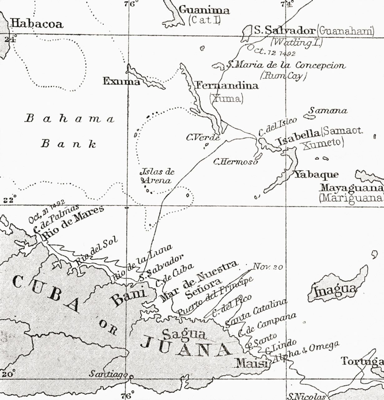 콜럼버스는 과나하니 섬을 떠났다. 그의 일지에서 과나하니라는 원주민 이름을 더는 사용하지 않았다. 과나하니는 벌써 스페인식으로 산살바도르로 바뀌었다. 그가 향한 곳은 원주민들이 ‘지바우’라고 말한 섬이다. 쿠바다. 이곳에서도 비중격을 뚫은 금 장식물을 보았다. 과나하니 섬에서 배에 태운 원주민 가이드가 말하기를 지금 가고 있는 이 쿠바섬에는 사람들이 금으로 만든 큰 목걸이를 차고, 다리에도 팔에도 차고 다닌다고 했다. 콜럼버스는 이제 곧 황금이 쏟아지리라 기대했다. 원주민들은 이 섬을 “골바Colba”라고 한다고 콜럼버스는 항해 일지에 2번 적었다. 하지만 콜럼버스는 더는 “골바”라고 쓰지 않고 “지바우Cibou”라 기록했다. 왜 그랬는지는 알 수 없다. 어차피 새로 기독교식으로 이름을 붙일 터. 원주민이 무엇이라 부르든지 그런 따위는 중요하지 않았을 것이다. 콜럼버스는 쿠바섬을 후안 섬이라 명명했다. 새로운 예루살렘, 천년왕국의 재림 예수가 될 후안 왕자에게 이 땅을 헌정한다는 의도였다. 그러나 후안 섬이라는 이름은 오래 쓰이지 못했다. 얼마 지나지 않아 후안이 죽었기 때문이다. 콜럼버스 다음으로 이 섬에 온 스페인 사람들은 이 섬을 구바나칸Cubanacán이라 불렀다. 구바나라는 왕이 다스리는 땅이라는 뜻이다. 원주민들도 자신들의 최고 지도자를 칸이라고 일컬었다. 쿠바Cuba. 구바나칸을 스페인 사람들이 쿠바라 줄여 불렀다. 구바나칸이라는 지명은 베네수엘라 앞바다 섬에도 남아있다. 콜럼버스는 후안 섬을 지팡구라고 생각했다. 자신이 지금 읽고 있는 항해 지도가 그렇게 말하고 있었다. <동방견문록>은 지팡구를 ‘황금으로 지붕을 덮은 집들’이 있는 섬이라고 했다. <동방견문록>에서 보았던 그 섬, 어마어마한 양의 황금이 넘쳐나는 땅에 이제 곧 도착한다고 기대했다.