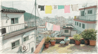 아파트 베란다 너머 광경은 정리되지 않은 과거와 현재의 삶이 뒤엉켜있었다. 오른쪽은 가파른 언덕 위에 아슬아슬하게 집들이 매달려있는 절벽마을이 보였다.