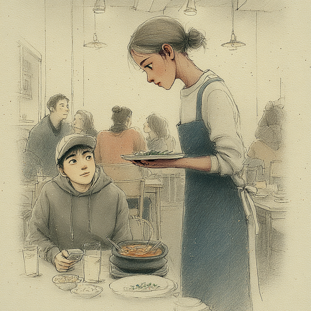 루아는 서빙 쟁반을 들고 정신없이 테이블 사이를 오갔다. 그날따라 눈에 띄는 손님이 있었다. 모자를 눌러쓴 대학생으로 보이는 청년. 늘 혼자 왔고, 오늘도 휴대폰을 뒤적이며 대충 메뉴를 고르고 있었다.