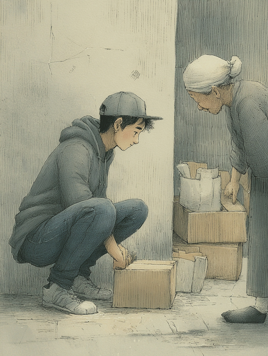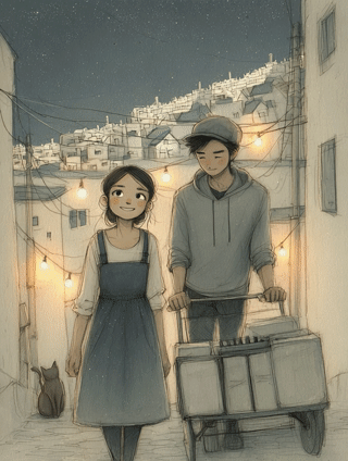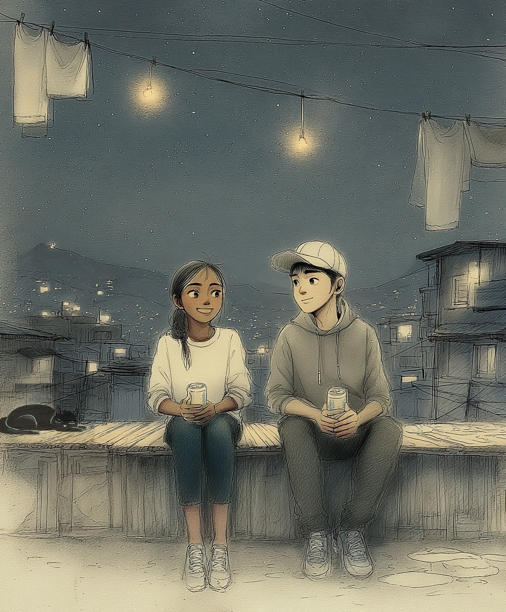 둘은 맥주 두 캔을 들고 옥상 평상에 나란히 앉았다. 바람은 빨랫줄 사이를 지나가고, 도시의 불빛은 멀리 깔려 있었다.