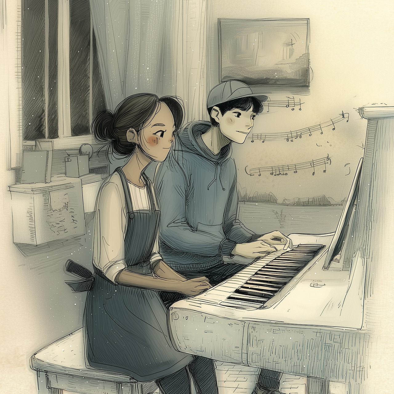 둘은 나란히 피아노 앞에 앉았다.