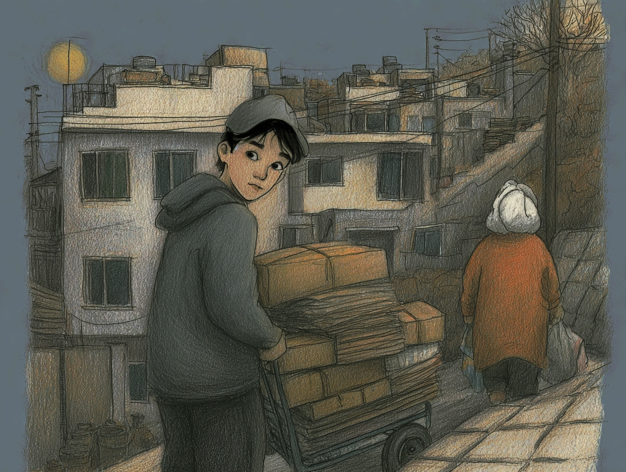 서준은 빈 수레를 끌고 내려오며 묘한 감정이 밀려왔다. ‘같은 서울인데, 이토록 다른 세상이 있다니!’